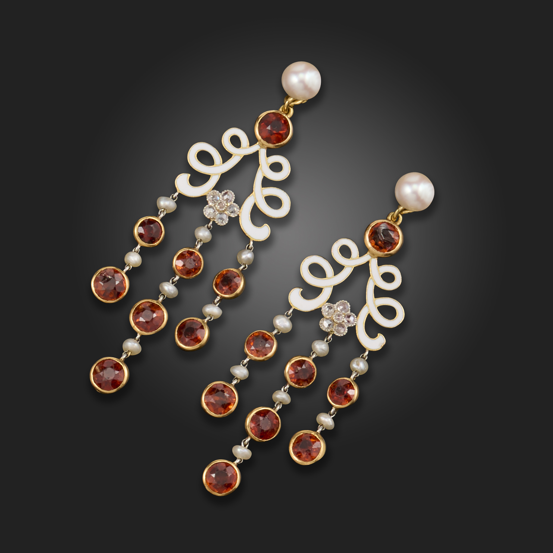 A pair of mandarin garnet, diamond and seed pearl drop earrings, suspending from a double scroll deaign with white enamel decoration in gold, hook fittings, 6cm high