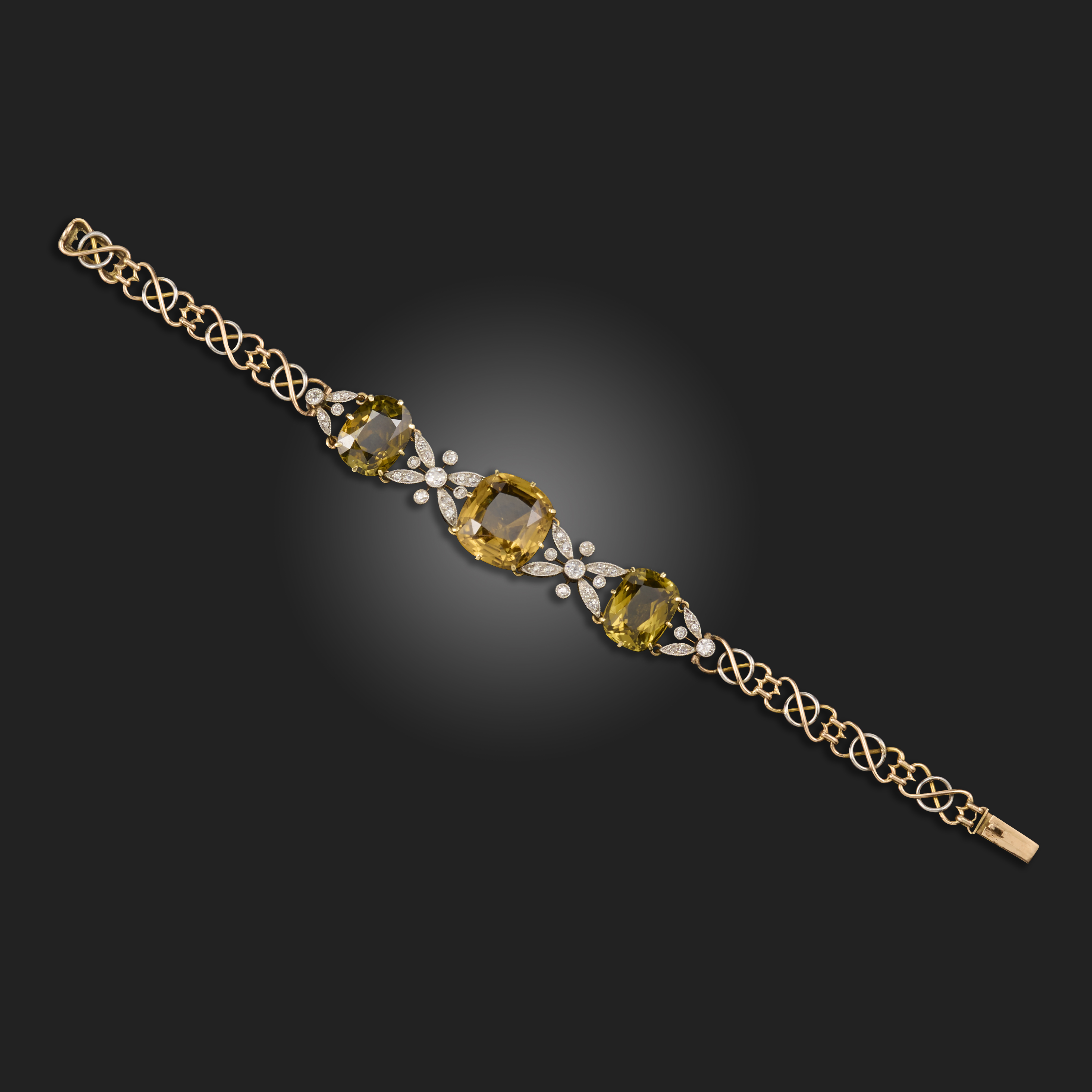 An Edwardian zircon and diamond bracelet, the centre section set with three cushion-shaped zircons, the foliate connecting links millegrain-set with old circular-cut diamonds in platinum on gold, on a platinum and gold fancy-link bracelet, 17cm long, fitted case