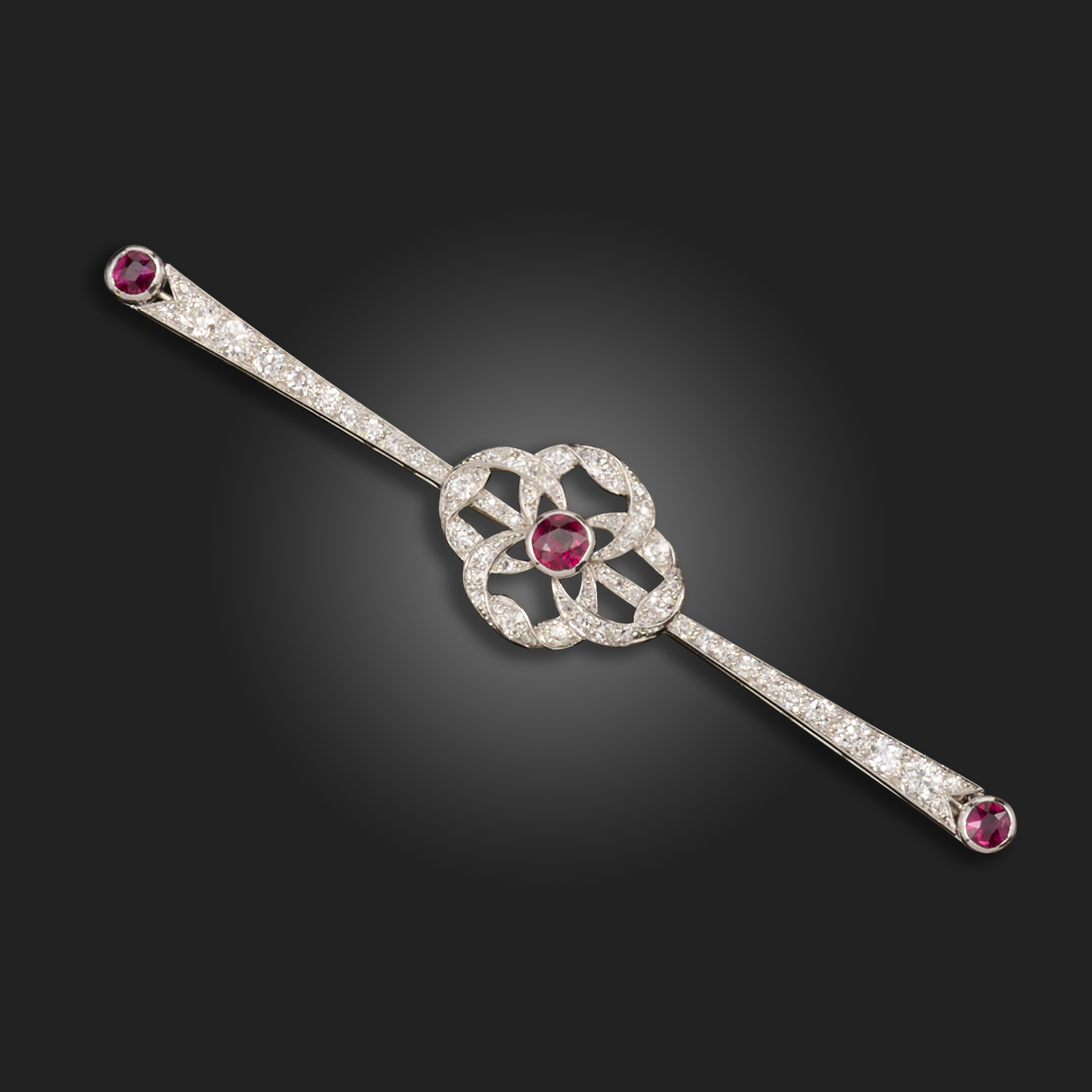 A ruby and diamond bar brooch, set in white gold, 7.5cm wide, Harrods case