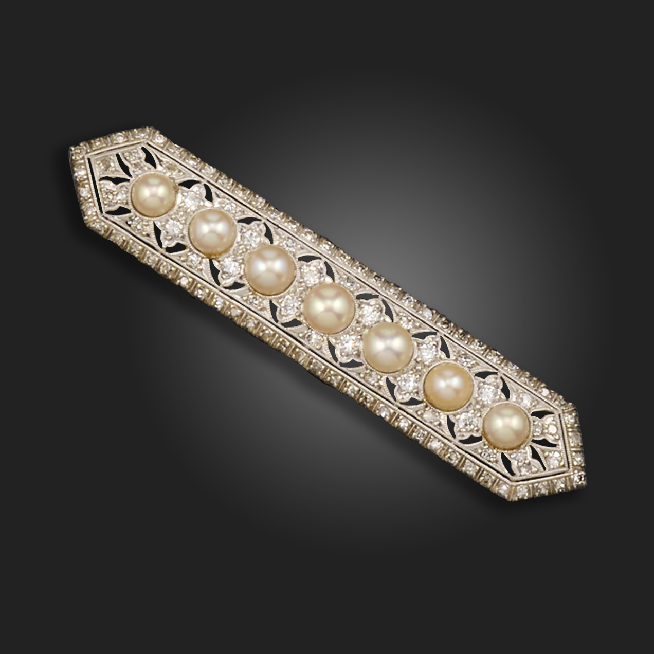 A pearl and diamond bar brooch, set with a row of untested pearls and set overall with old circular-cut diamonds, with pierced decoration in platinum, 5cm wide, fitted case by Asprey