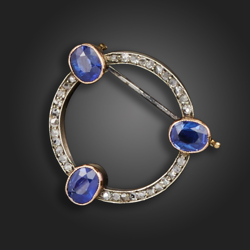 A Russian sapphire and diamond circular brooch, set with rose-cut diamonds and three oval-shaped sapphires in silver on gold, 56 zolotnik and St Petersburg mark, rubbed workmaster's initials, 2.5cm wide