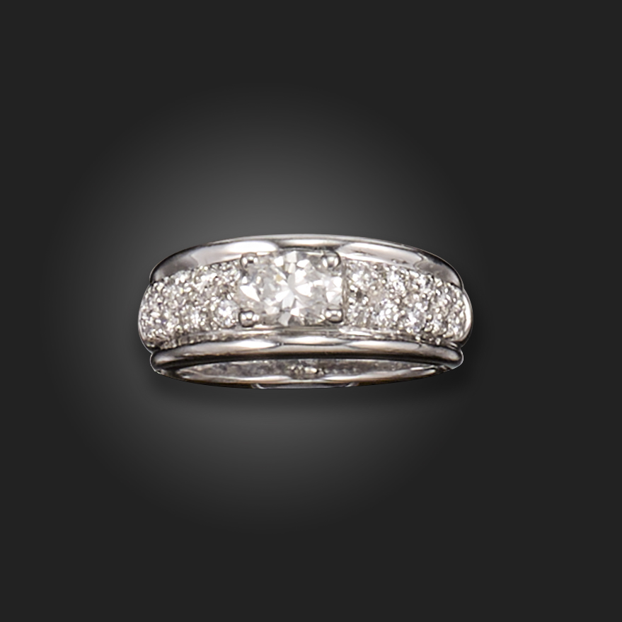 A diamond half hoop ring by Boucheron, set with an oval shaped diamond within shoulders set with graduated round brilliant-cut diamonds in 18ct white gold, French control marks, signed and with maker's lozenge, numbered B353 22634, size J