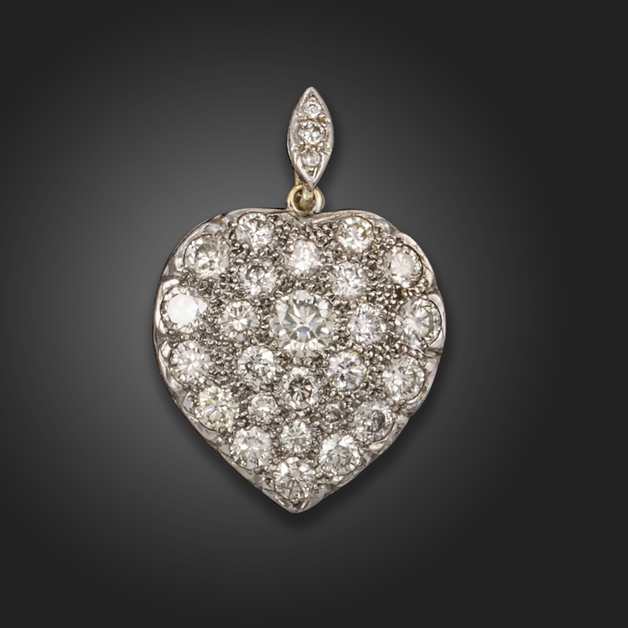 A diamond-set heart pendant, pave-set with graduated circular-cut diamonds in silver and gold, with diamond-set pendant loop, 3.5cm high