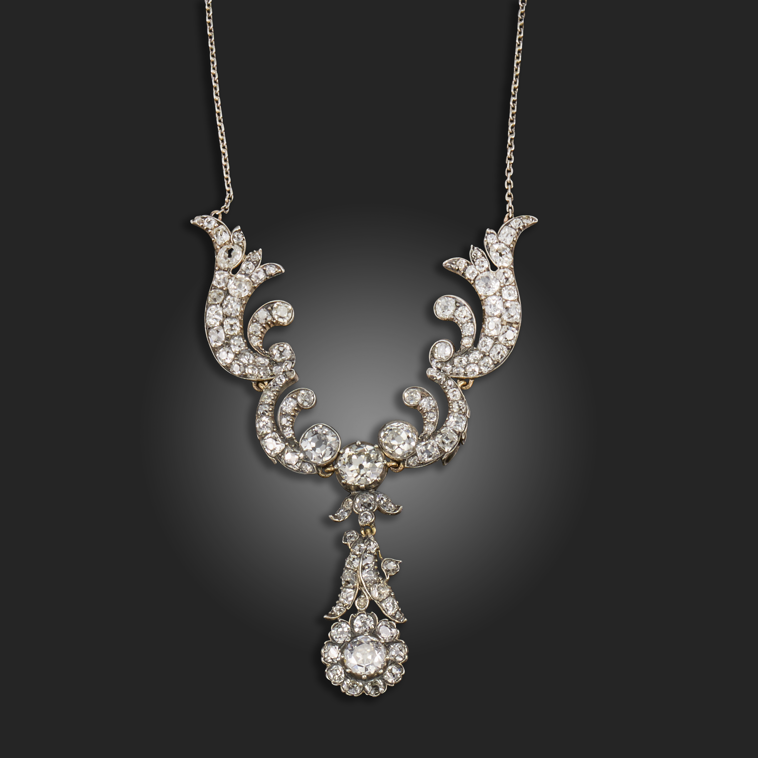 A late 19th century diamond necklace, the foliate scroll upper section centred with an old circular-cut diamond weighing approximately 0.99cts, suspending a detahcable foliate drop section centred with an old circular-cut diamond weighing approximately 0.60cts, set overall with old cushion-shaped diamonds in silver on gold, on a later fine-link silver neck chain, necklace 38cm long