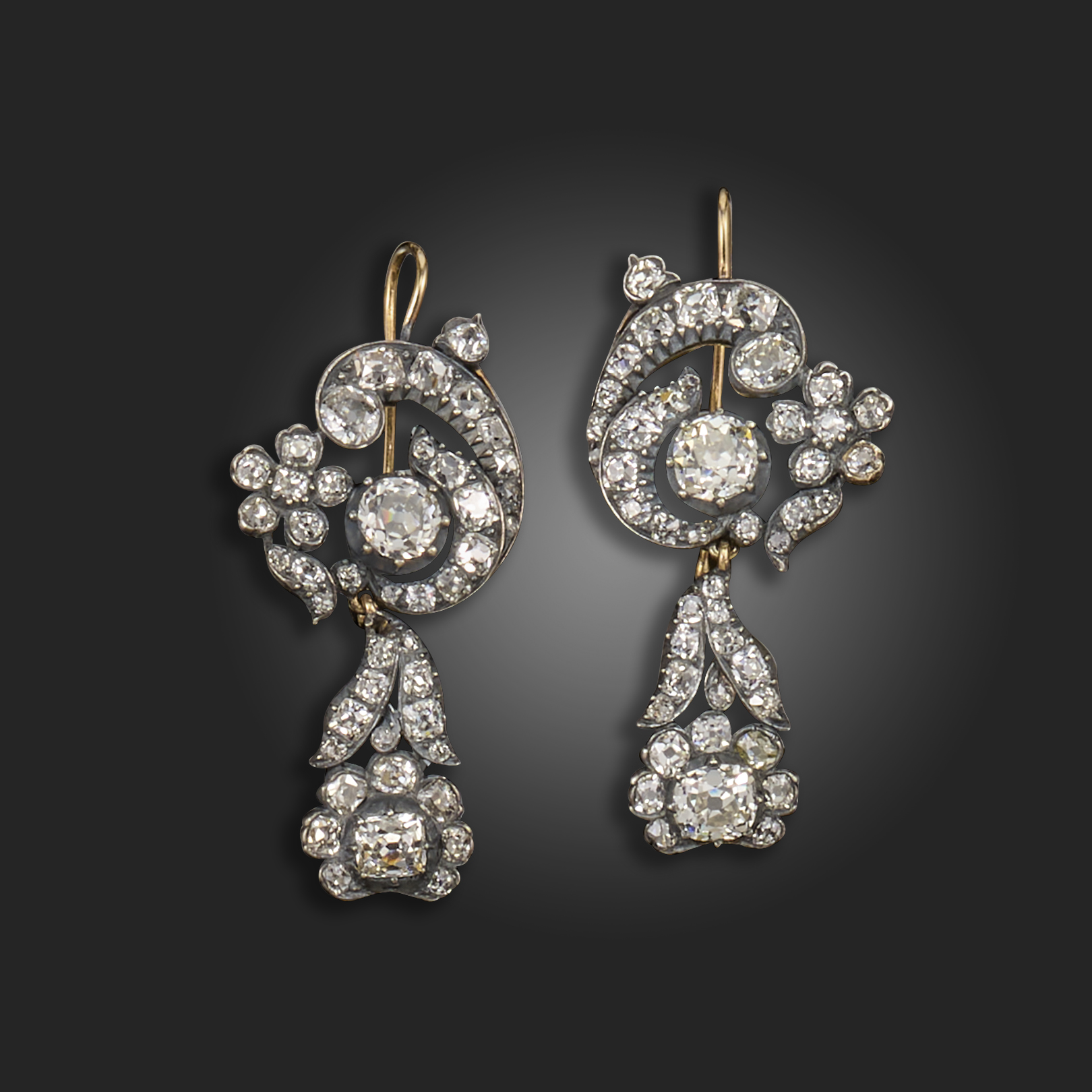 A pair of late 19th century diamond drop earrings, of scrolling foliate design, each centred with an old circular-cut diamond weighing approximately 0.60cts and suspending a foliate drop section in silver on gold, one diamond missing, hook fittings, 3.5cm high