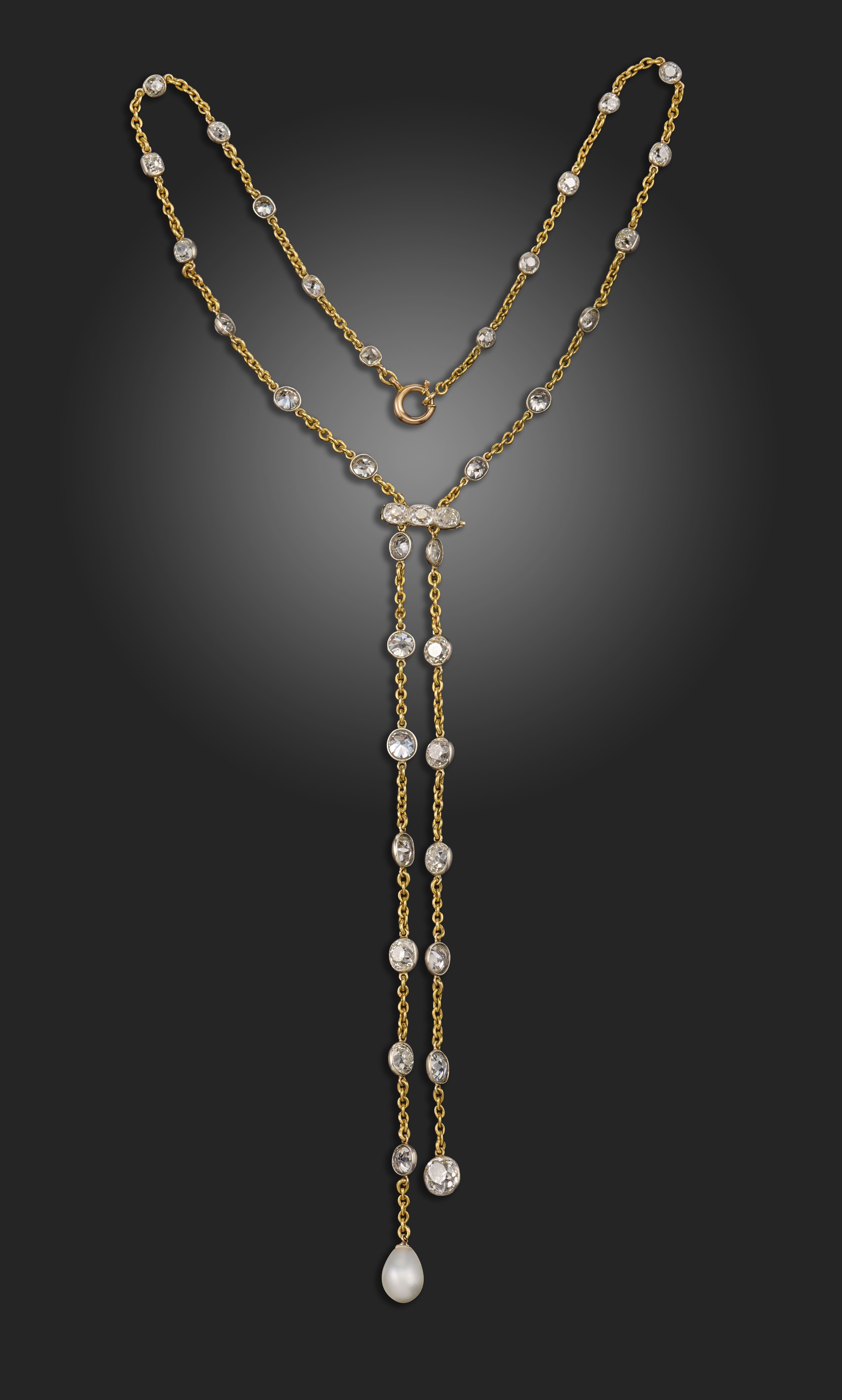 A diamond and natural pearl-set long guard necklace, set with graduated old cushion-shaped diamonds in silver spectacle mounts on a gold chain, suspending a natural pearl to one end and joined around the neck by a triple diamond clasp, 65cm long