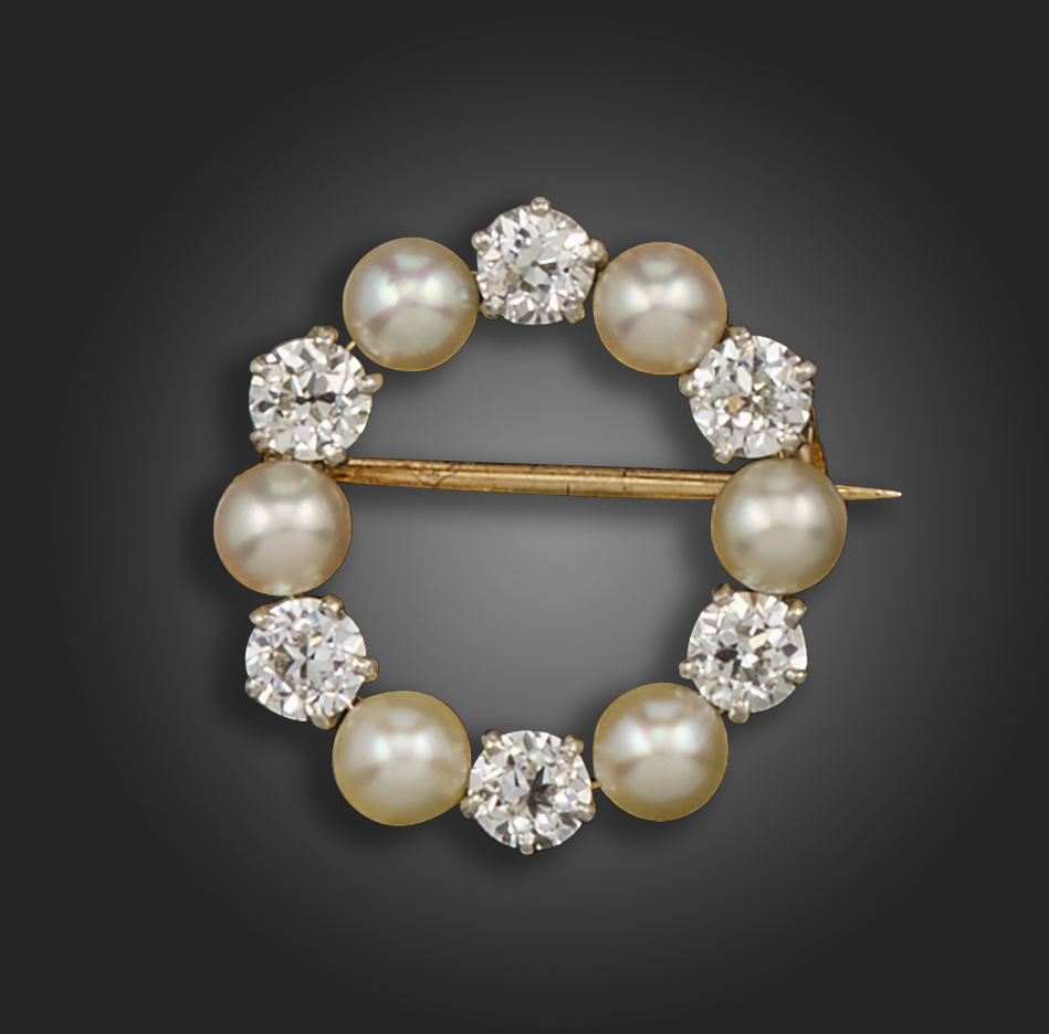 A natural pearl and diamond circular brooch by Tiffany & Co., alternately-set with natural pearls and transitional round brilliant-cut diamonds in gold, signed Tiffany & Co, 2.3cm wide