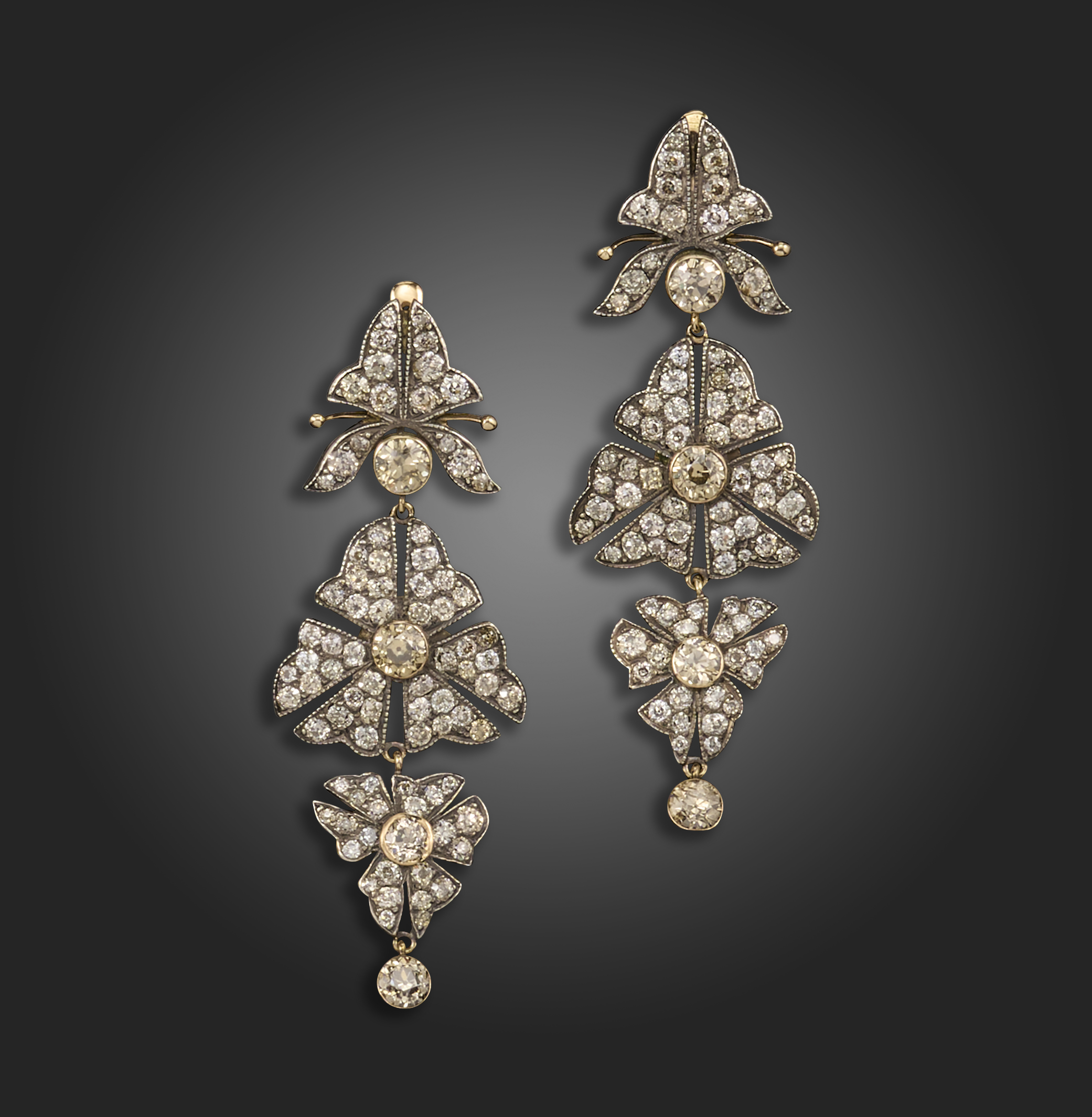 A pair of Russian diamond drop earrings, of stylised foliate design millegrain-set with graduated old circular-cut diamonds in silver and gold, marked 56 zolotnik and St Petersburg marks, 6cm long,