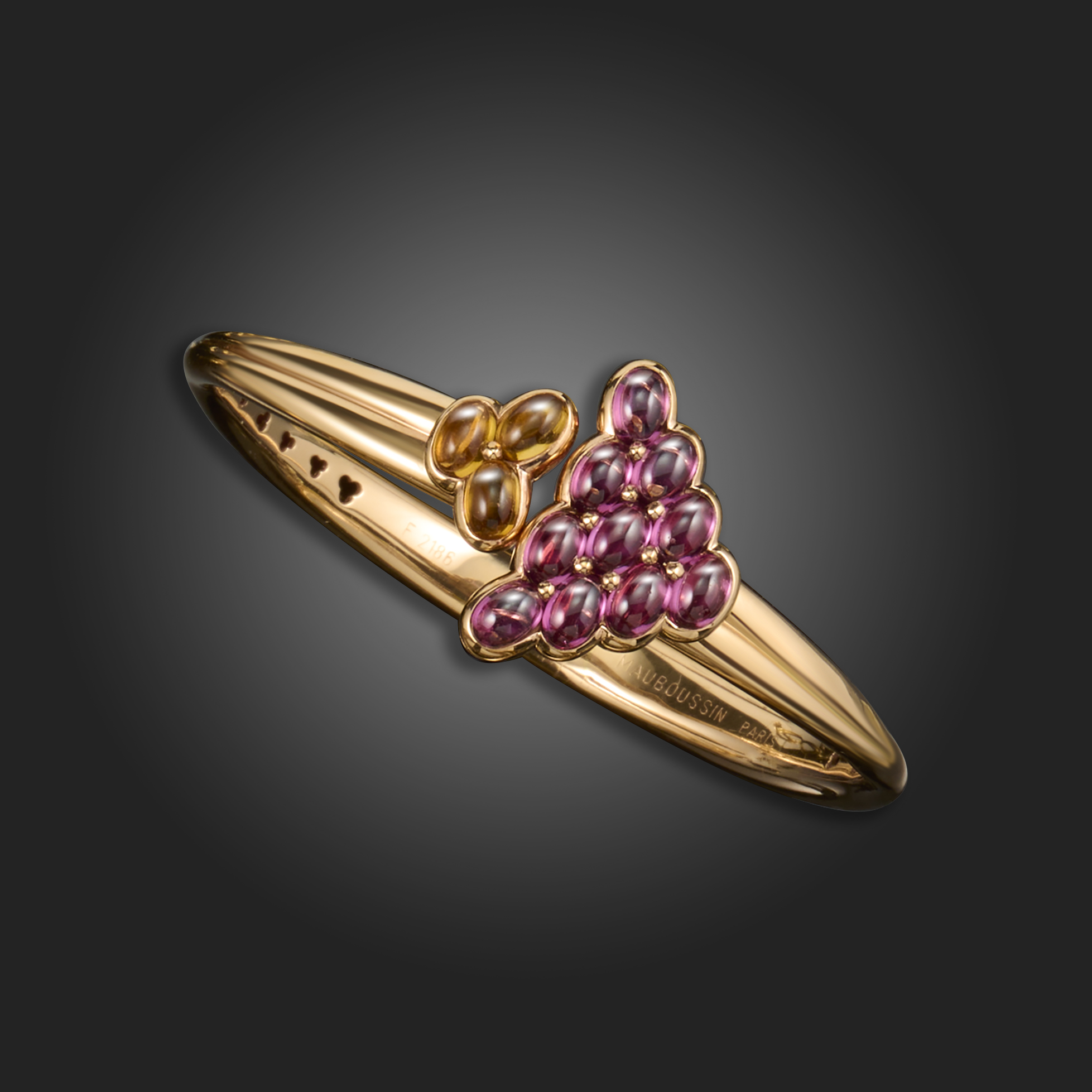 A gem-set gold bangle by Mauboussin, rubover-set with three cabochon citrines and ten cabochon tourmalines in gold, signed Mauboussin Paris, maker's mark, numbered F2186, 16cm internal diameter approximately