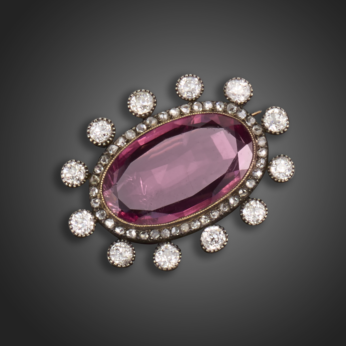 A 19th century spinel and diamond brooch, set with an oval-shaped pink spinel within a surround of rose-cut diamonds, with further outer row of old circular-cut diamonds millegrain-set, all in silver on gold, 3.7cm wide, case