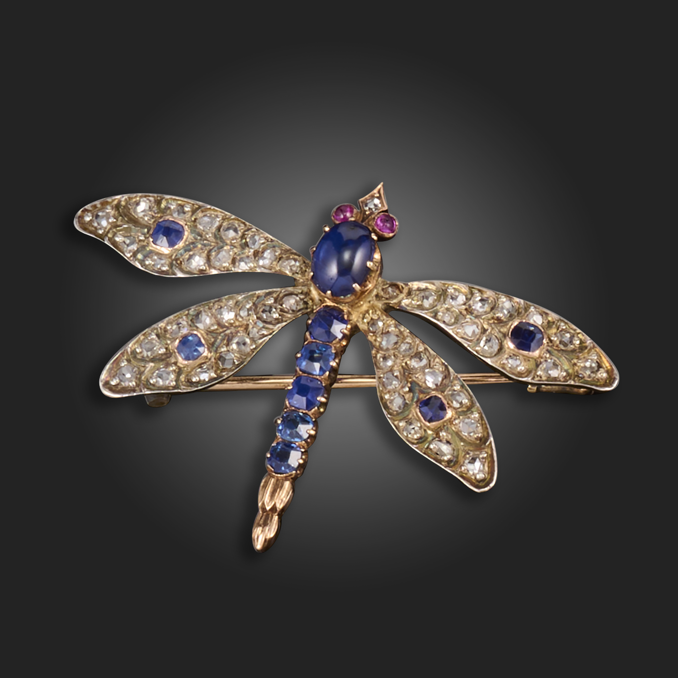 A late Victorian gem-set dragonfly brooch, the body set with a cabochon sapphire and graduated cushion-shaped sapphires, with ruby eyes and pave-set sapphire and rose-cut diamond wings, in silver and gold, 5cm wide