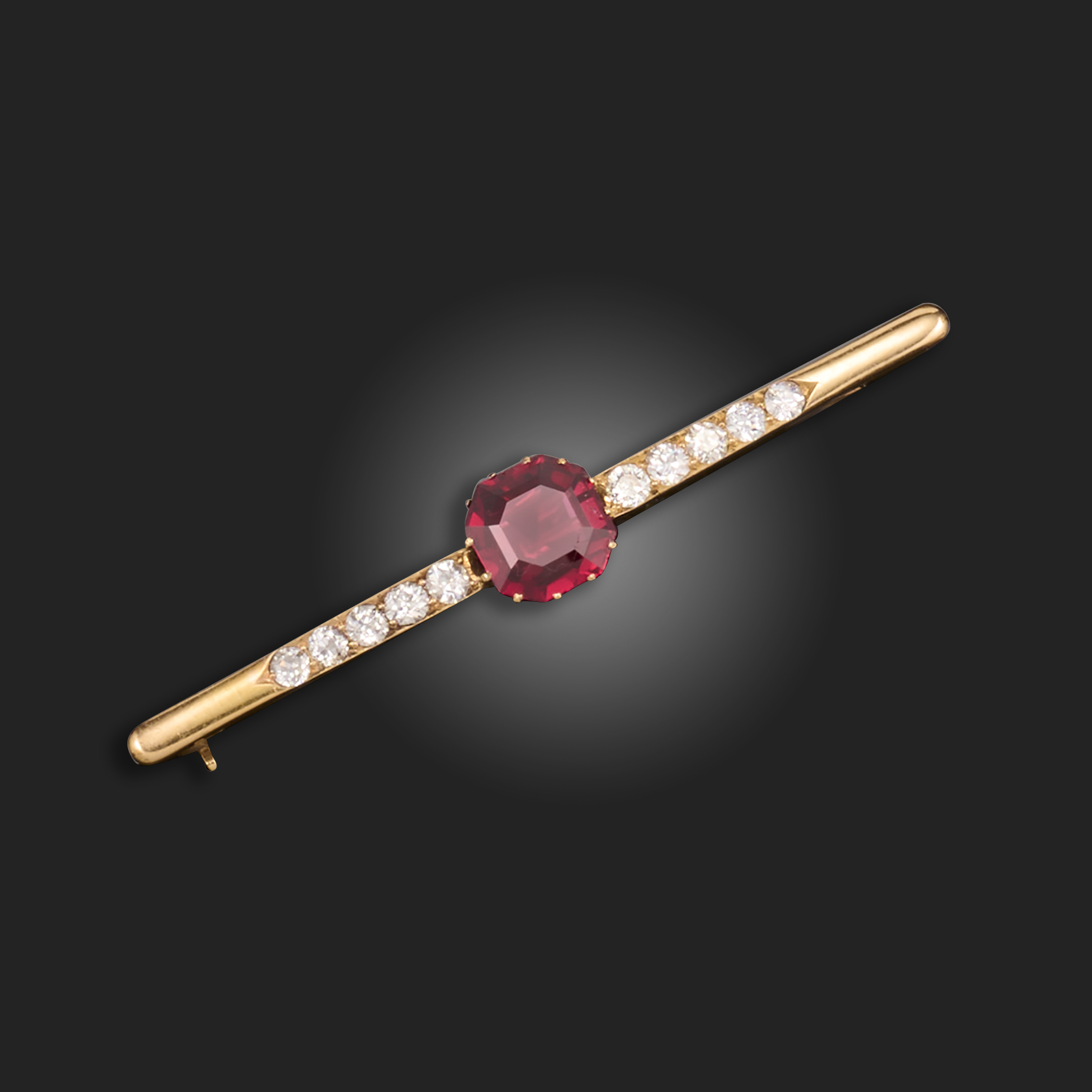 A spinel and diamond bar brooch, the emerald-cut red spinel weighs approximately 3.20cts, claw set on a gold bar brooch set with graduated old circular-cut diamonds, 6cm wide, fitted case