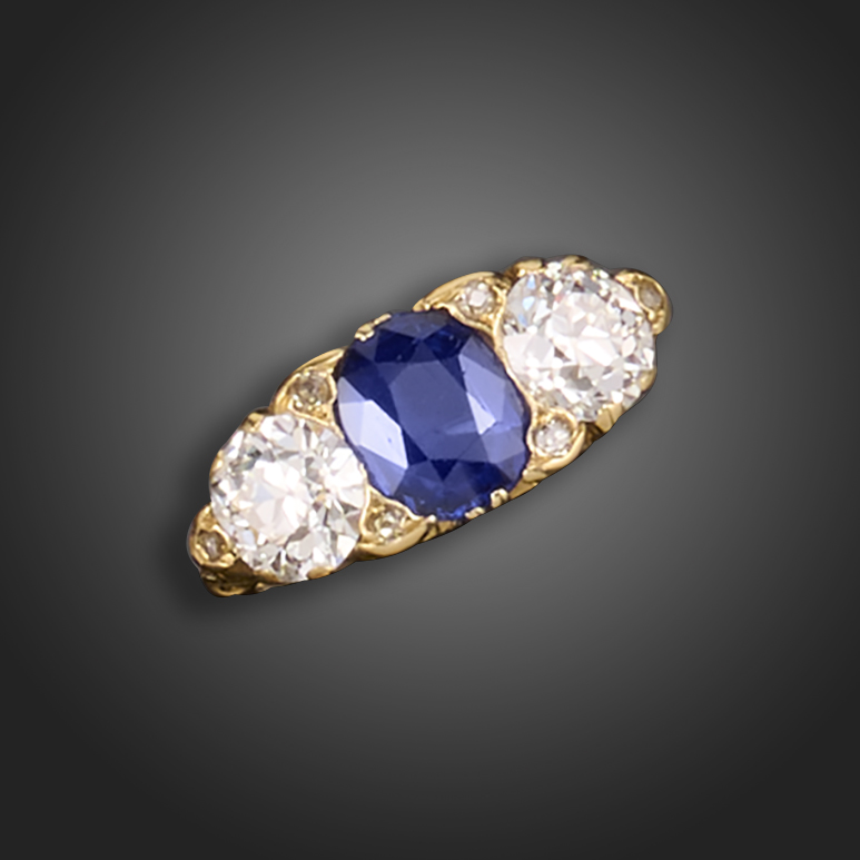 A sapphire and diamond three-stone ring, the cushion-shaped sapphire set with two old circular-cut shoulder diamonds, in a pierced scroll carved gold mount, size J
