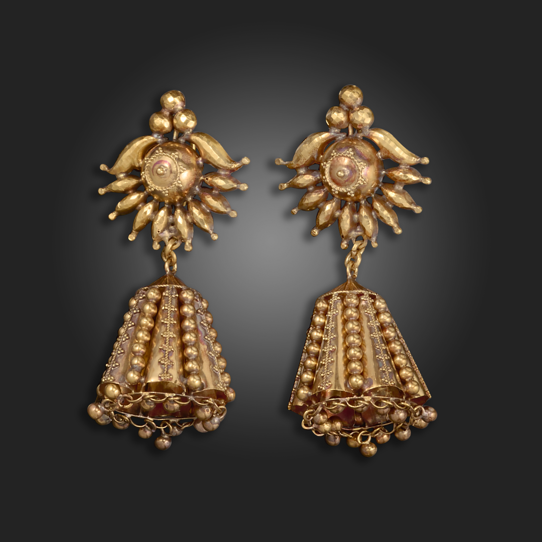 A pair of late 19th century gold drop earrings, possibly Indian, the conical-shaped bodies with pellet decoration and suspending ball pendants, with scrolling gold upper sections, 26cm high, centre opening case from Calcutta