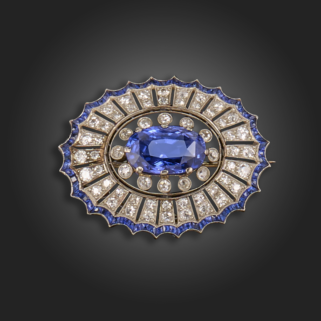 An early 20th century sapphire and diamond brooch, centred with an oval-shaped sapphire weighing approximately 5.50cts, within a surround of old circular-cut diamonds in platinum on gold, with further openwork surround set with single-cut diamonds and French-cut sapphires with scalloped edge in platinum, 3.5cm wide