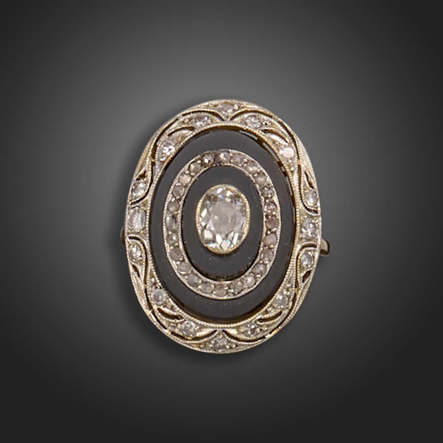 An onyx and diamond oval plaque ring, formed from an Art Deco onyx and diamond panel later mounted in a pierced diamond set surround in platinum and gold, size L ½