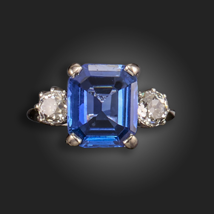 A sapphire and diamond three-stone ring, the emerald-cut sapphire weighs approximately 5.55cts, set with an old cushion-shaped diamond to each shoulder in platinum, size J 1/2