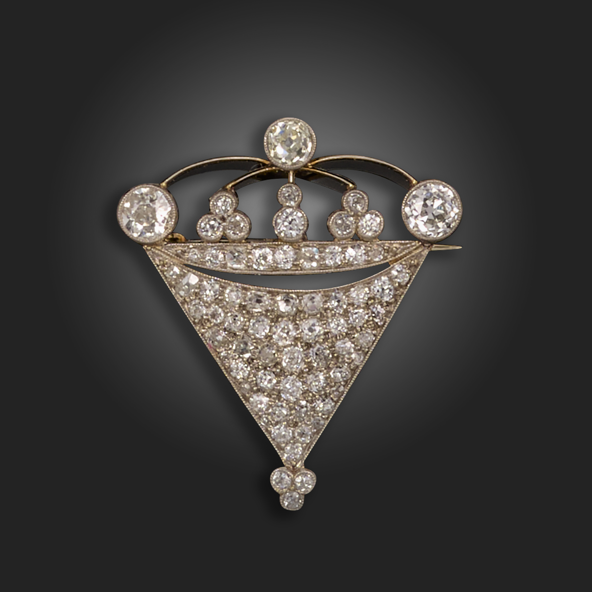 An early 20th century diamond brooch, the triangular body surmounted with a stylised coronet, pave and millegrain-set overall with old circular-cut diamonds in white gold, 3.5cm high, principal diamonds approximately 0.40, 0.20 and 0.35cts, fitted case by Mrs Newman, 68 Duke Street