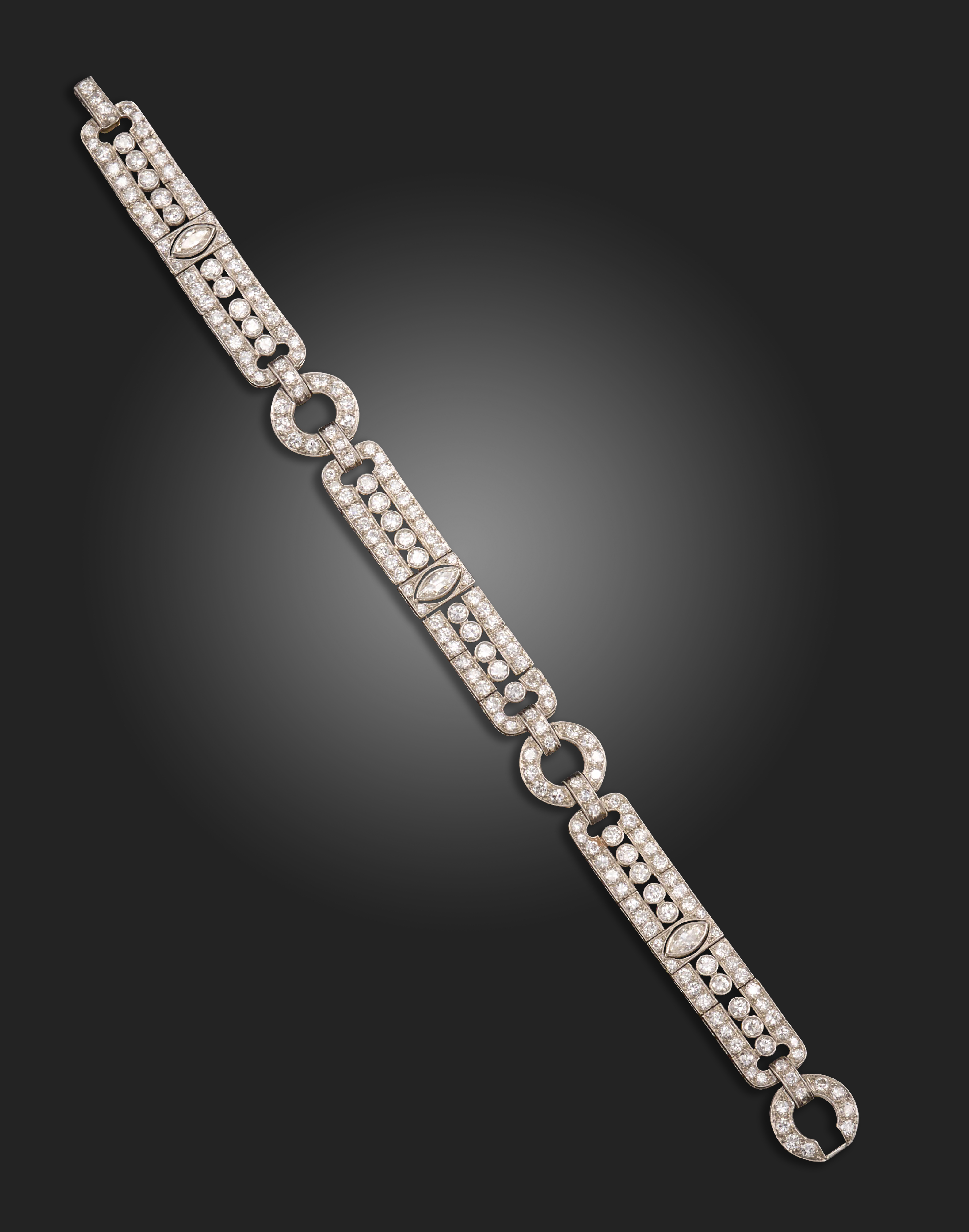 An Art Deco diamond bracelet, the three plaques are each centred with a marquise-shaped diamond within rows of circular-cut diamonds, joined with diamond-set circular links and conforming circular clasp in platinum, 18cm