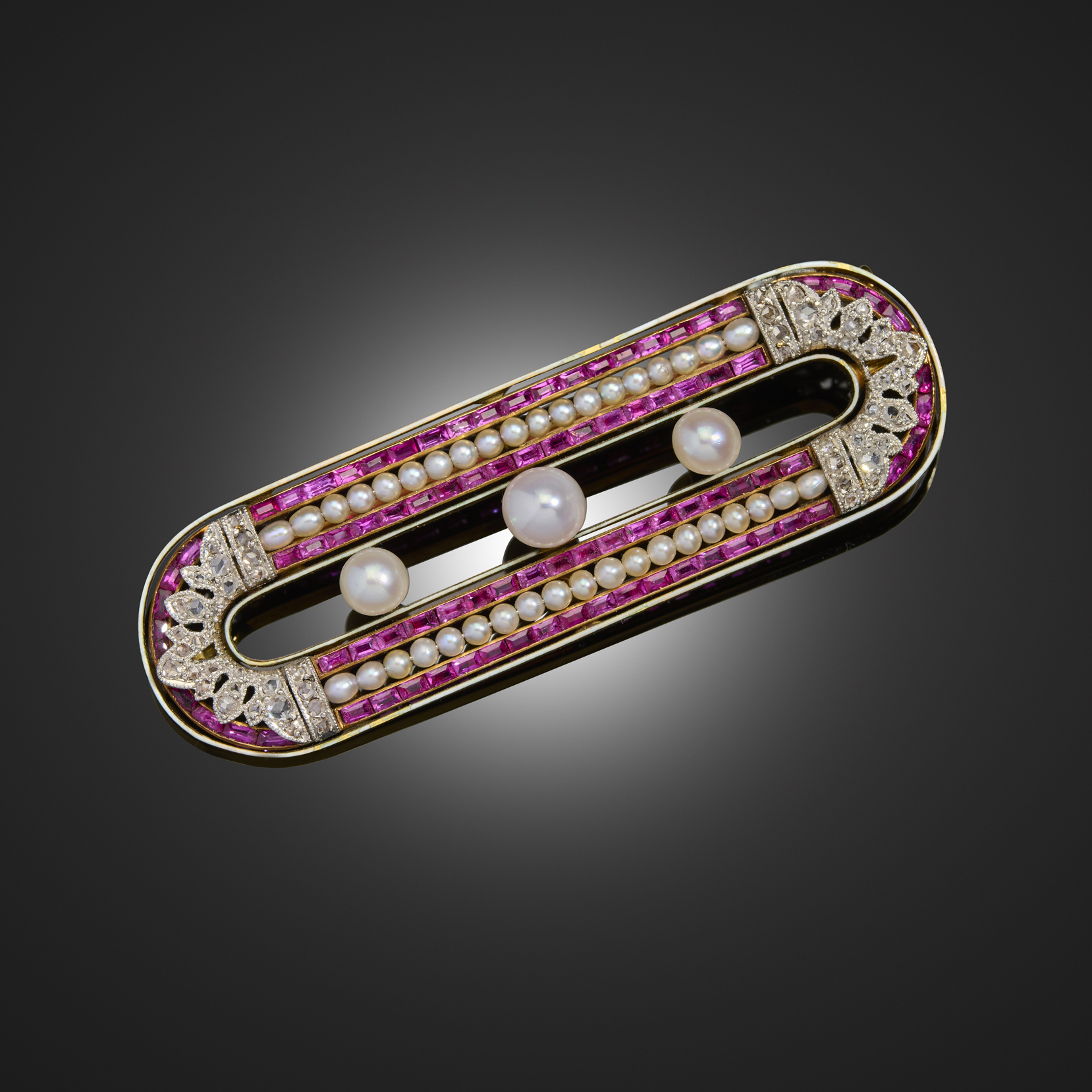 An early 20th century natural pearl, ruby and diamond brooch by Chaumet, the oval brooch centred with three natural pearls within a surround of calibre-cut rubies and seed pearls with white enamel border, with rose-cut diamond-set foliate terminals in platinum and gold, French control marks and maker's mark for Joseph Chaumet, 5.6cm long fitted Chaumet case