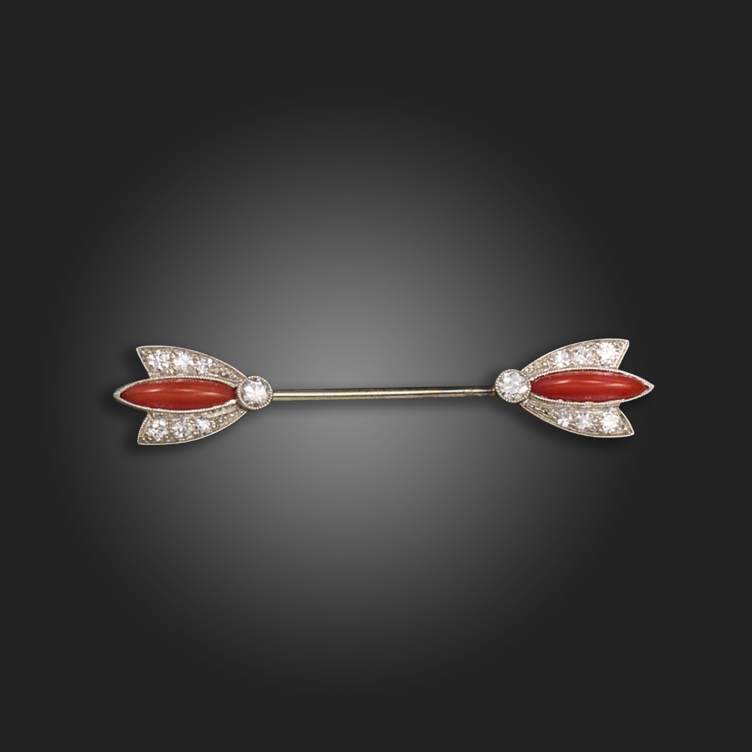 λ An early 20th century coral and diamond-set jabot pin, the foliate form terminals set with coral and old circular-cut diamonds in platinum, numbered 1230, 4.7cm long
