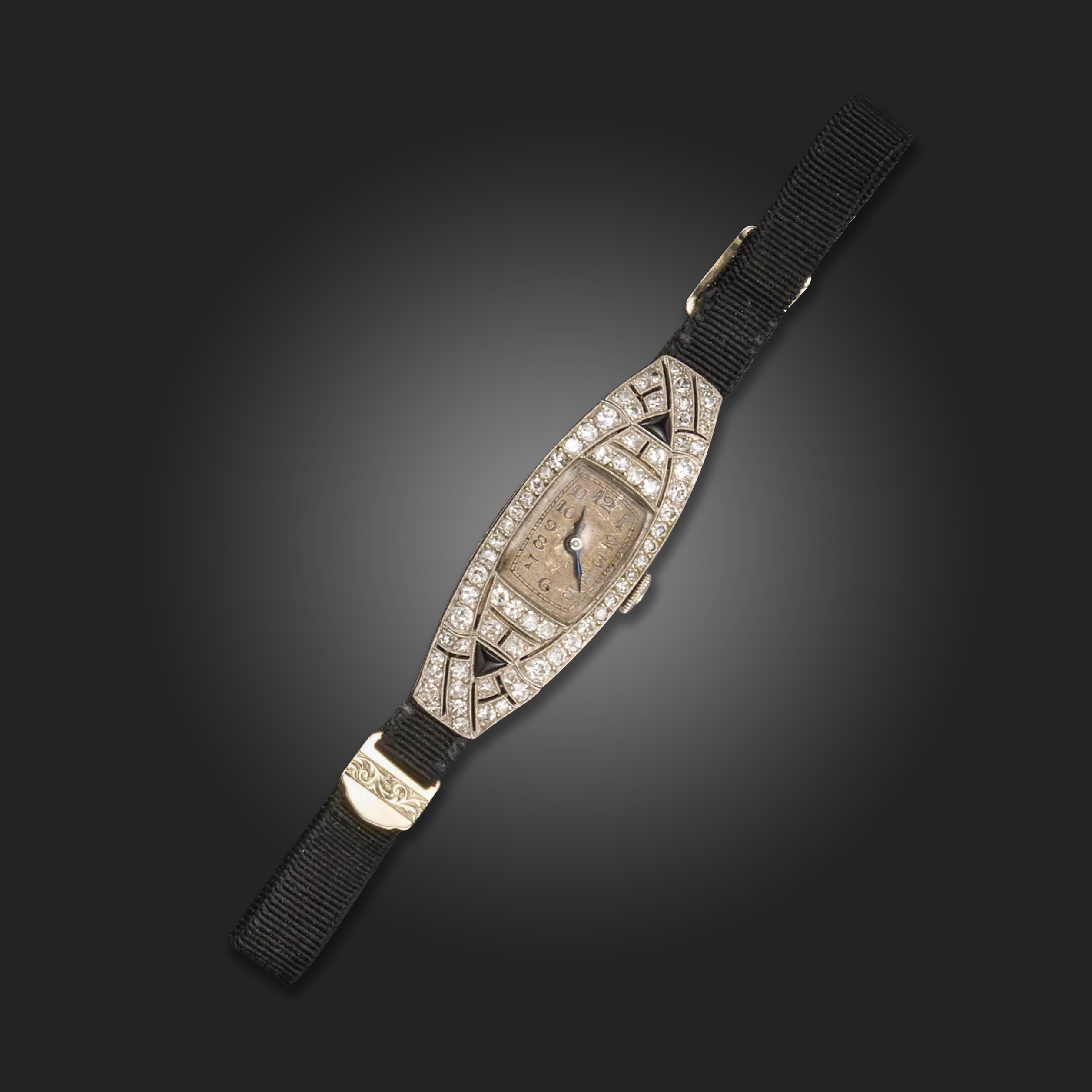 A lady's diamond-set Art Deco wristwatch, the dial marked MOVADO, set with gadauted circular cut diamonds and black onyx in platinum, black silk band, white gold clasp, face 4.3cm long