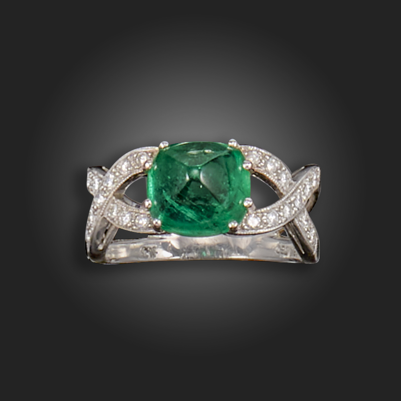 An emerald and diamond ring, the sugarloaf cabochon emerald is set with round brilliant-cut diamonds to bifurcated scroll shoulders in white gold, size N