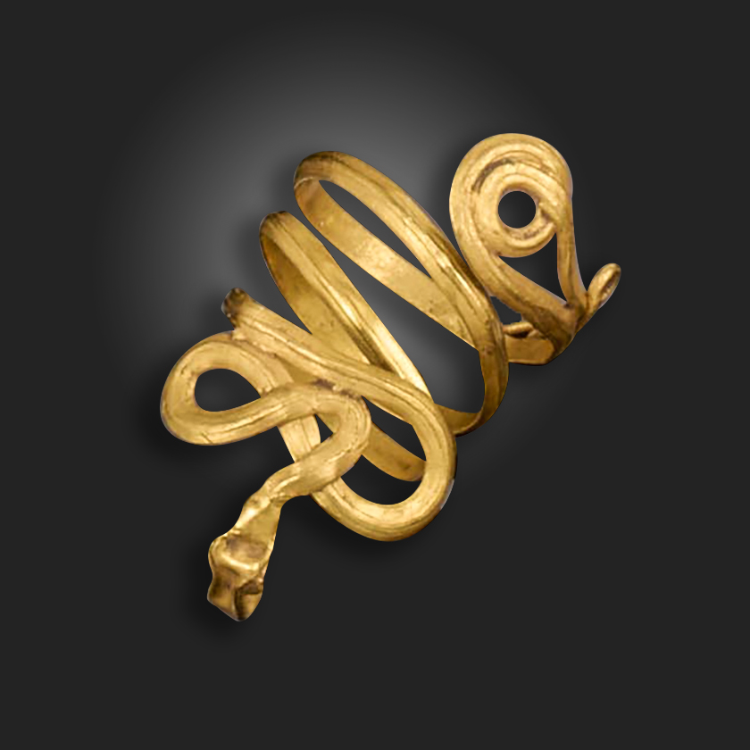 A Hellenistic/Ptolemaic gold snake ring, c.2nd century BC, the coiled snake with knotted neck and red stone eyes