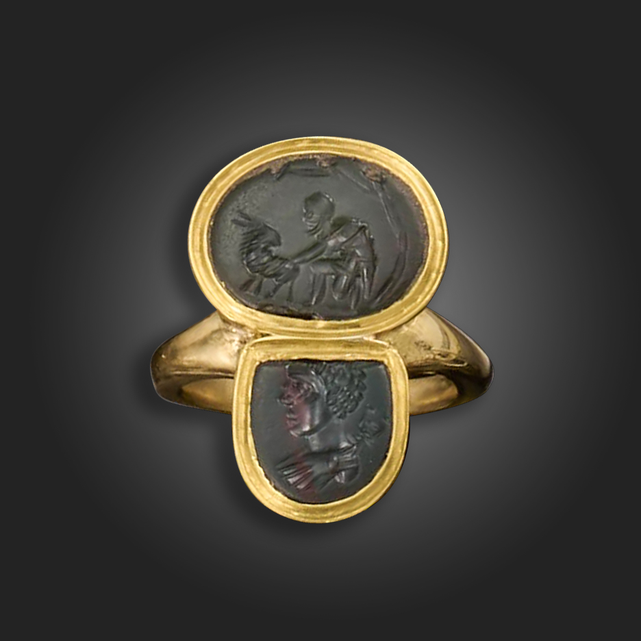 A Roman double hardstone intaglio ring, c.1st-2nd century BC, set with two green jasper intaglios, depicting a rural scene of a shepherd milking a goat and Mercury with his caduceus, set in a later gold ring, intaglios 1.0 and 0.7mm high, ring size M1/2