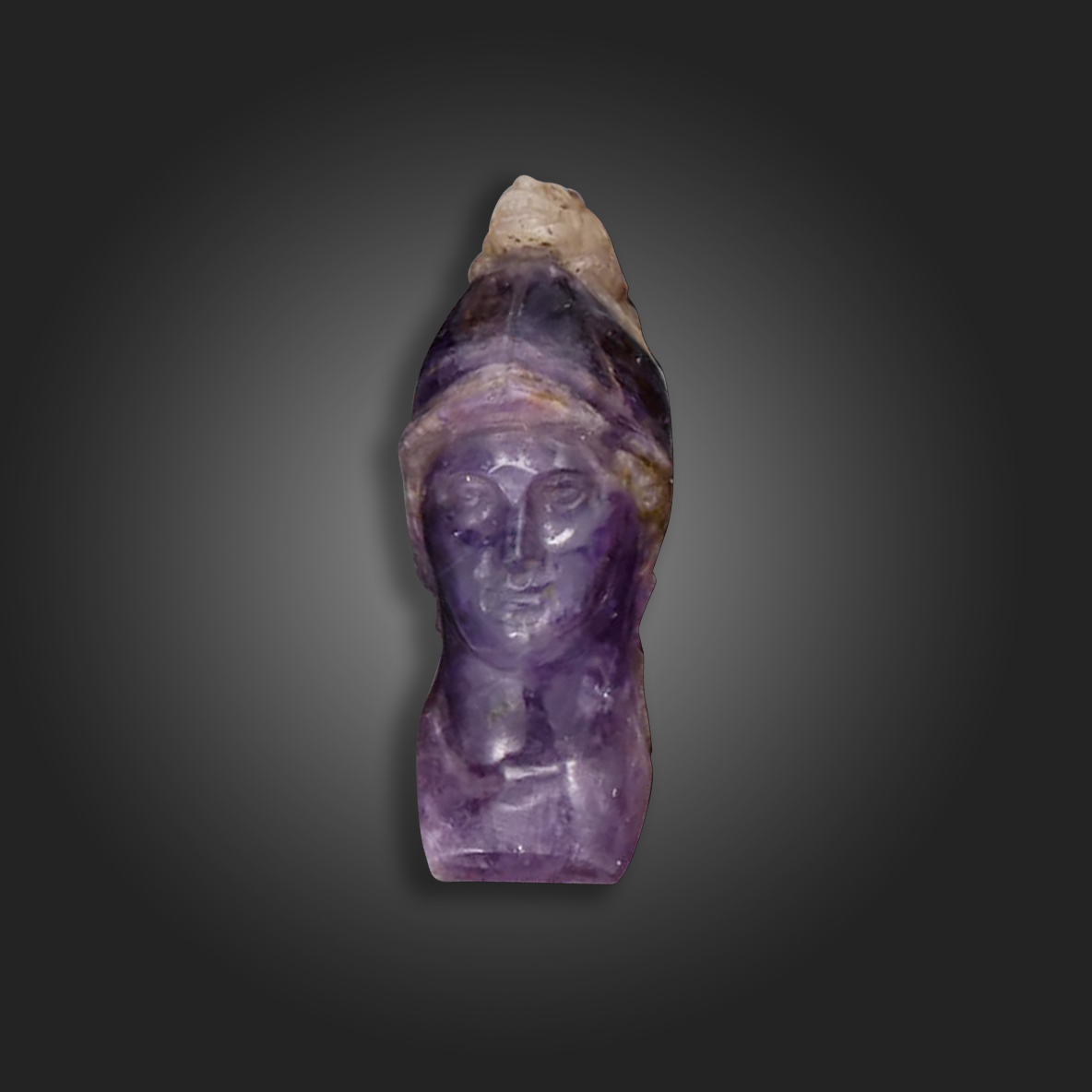 An 18th century carved hardstone bust, possibly depicting Achilles or Minerva in amethyst, 3cm high