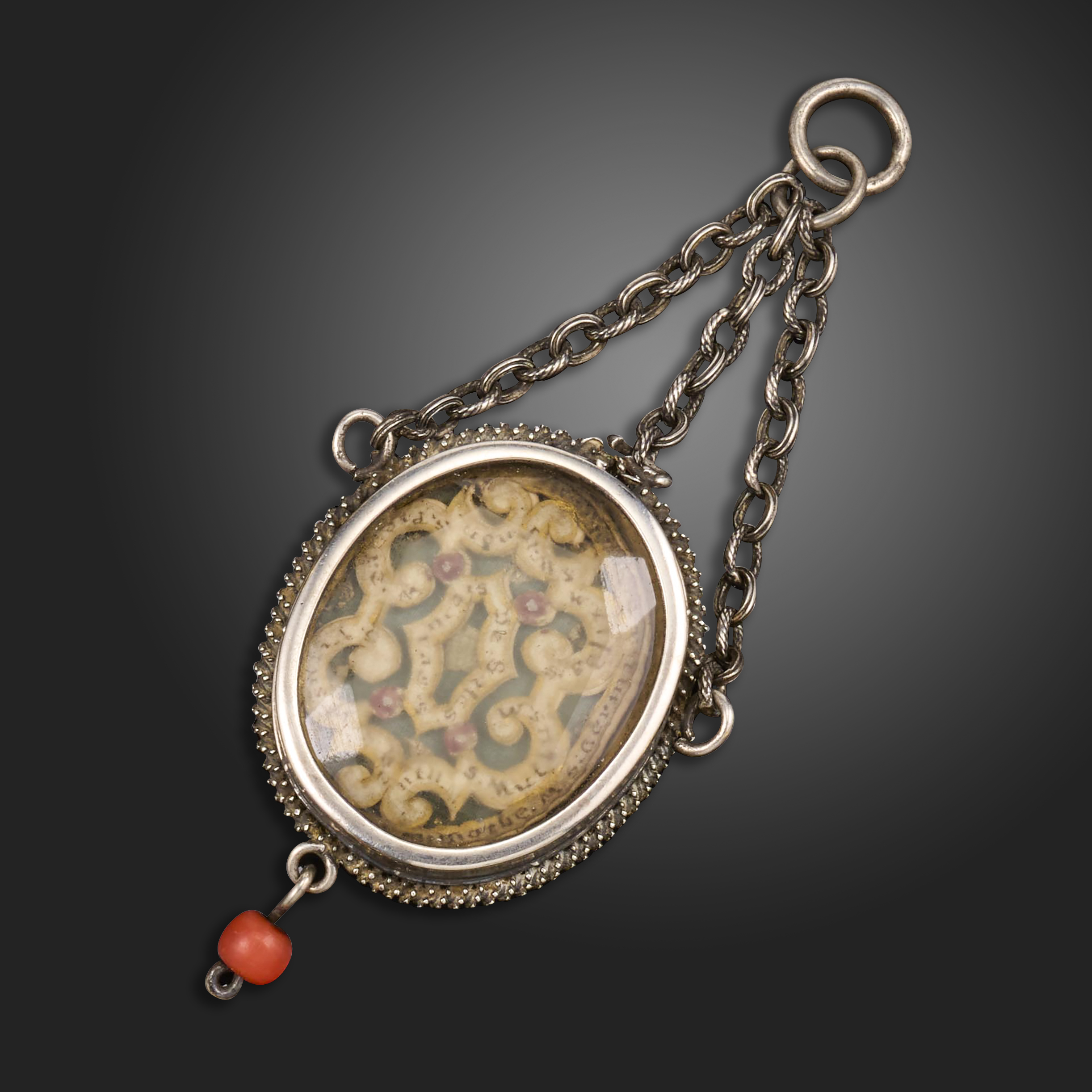 A mid 17th century silver locket pendant, possibly French, glazed with faceted glass and containing paper scrolls, inscribed with the names of martyrs or saints, twisted rope design to the border and with coral pendant, suspending from three silver chains, pendant 5cm high