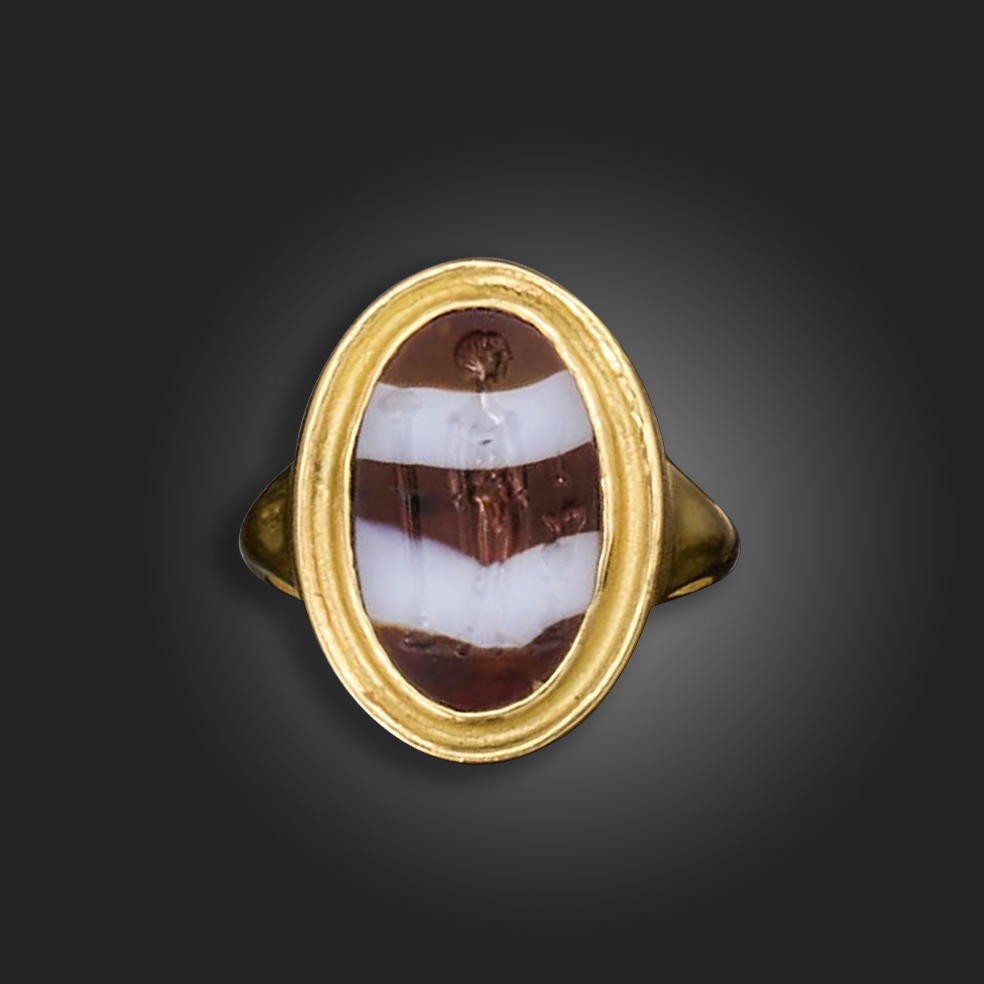 A Roman banded agate intaglio depicting an athlete, c.1st-2nd century BC, the athlete standing amongst washing instruments inlcuding a strygil and aryballos and holding weights, in a later gold ring mount, intaglio 1.7cm high, ring size P 1/2