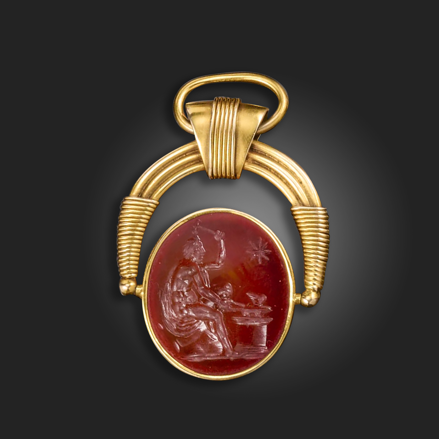 An 18th century carnelian intaglio depicting Hephasteus at his forge, in a later gold swivel pendant mount, intaglio 22mm high, pendant 4cm high
