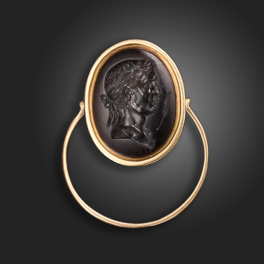 An 18th century sardonyx intaglio depicting the bust of an Emperor (probably Julius Caesar), in profile and wearing laurels, accompanied by a palm leaf, set in a gold collector's swivel mount, intaglio 1.6cm high, size M approximately