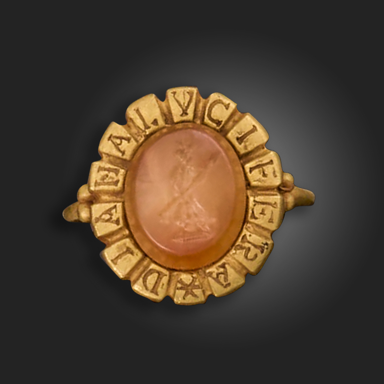 A Roman carnelian intaglio depicting the goddess Diana, c.2nd century AD, the standing figure of Diana holding a lighted torch, set in a later gold ring with latin inscription to the bezel reading 'Diana Lucifera', intaglio 12mm high, size L 1/2, 13g total