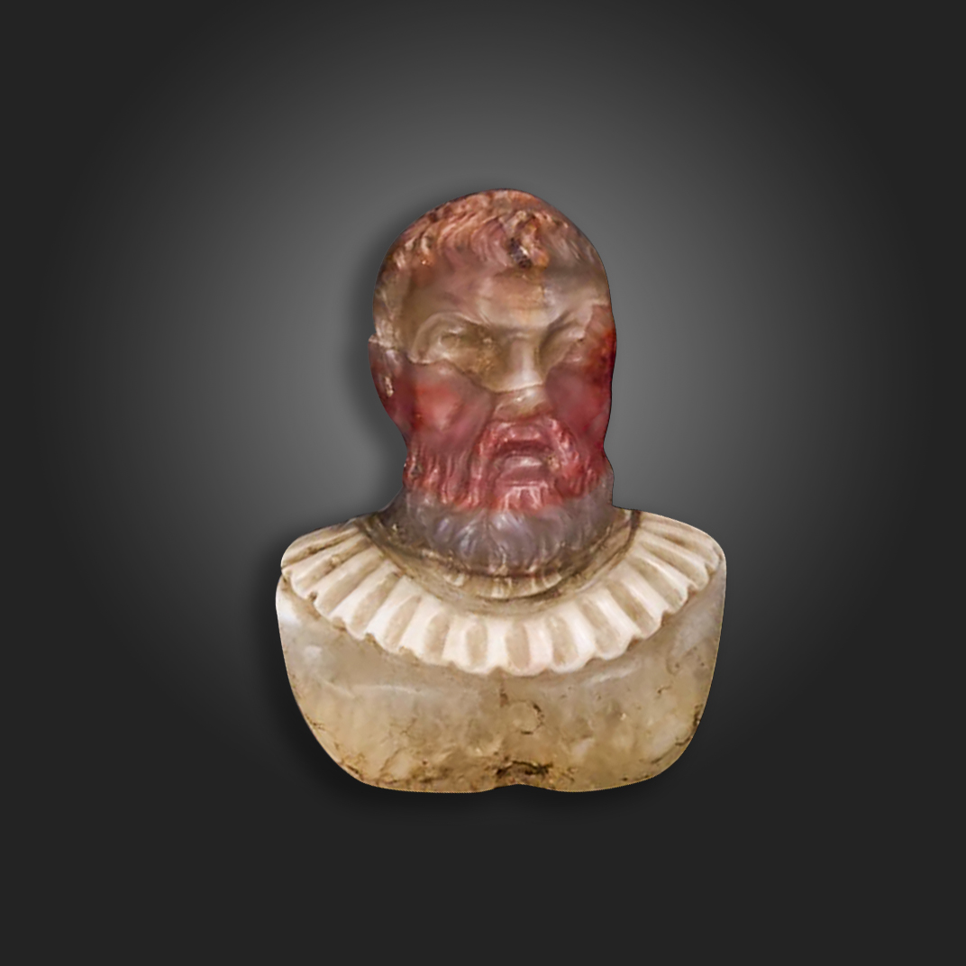 An early 17th century carved hardstone bust, possibly depicting a poet wearing a lace collar, engraved 'p' to the base, 2.7cm high
