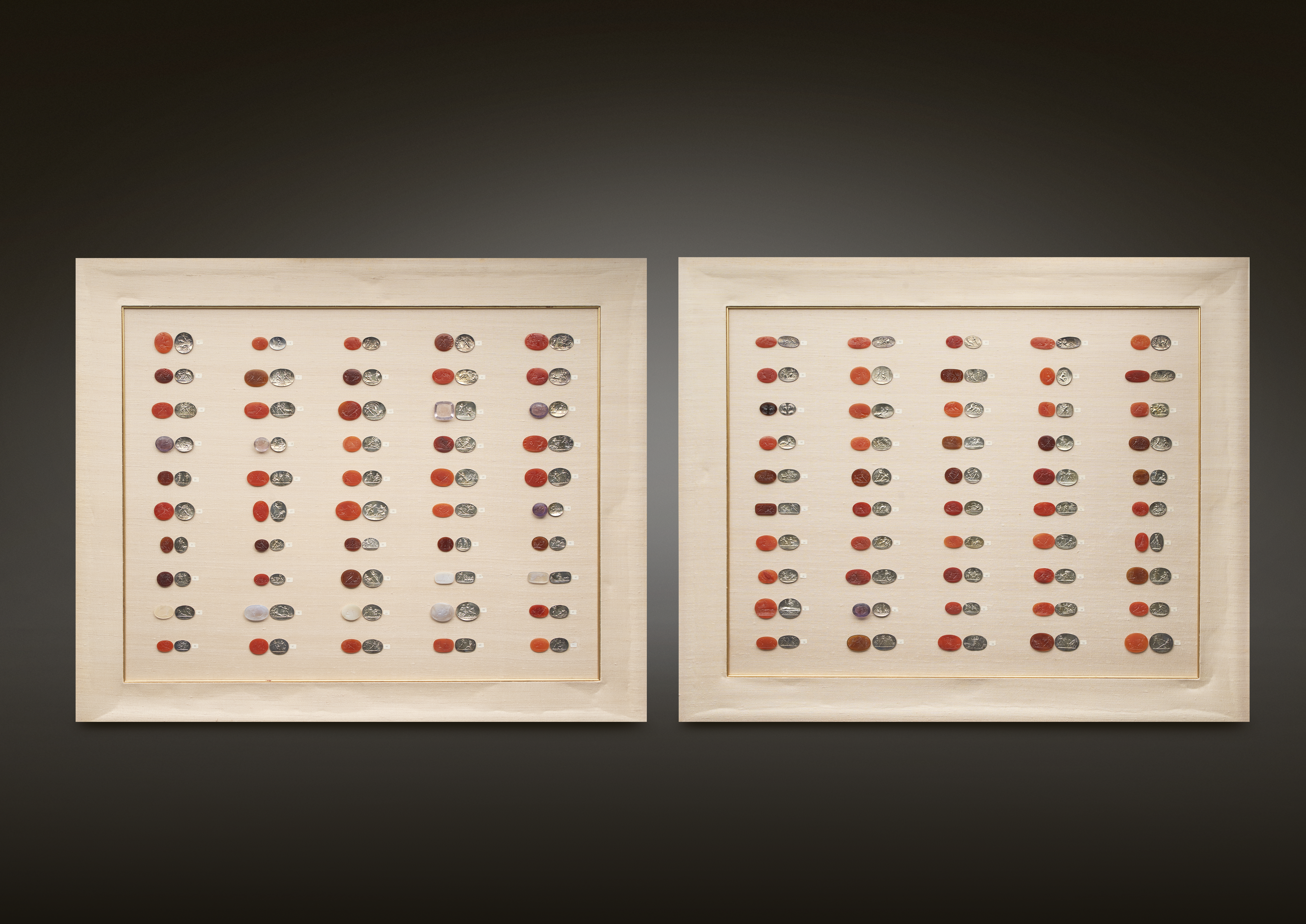 Each intaglio carved in carnelian, sardonyx, amethyst or chalcedony to depict a classical scene, with majority with Greek pseudo signature, each with an electrotype cast, in two wooden and Perspex frames each containing 50 intaglios and together with a hardbound reference catalogue with slipcase