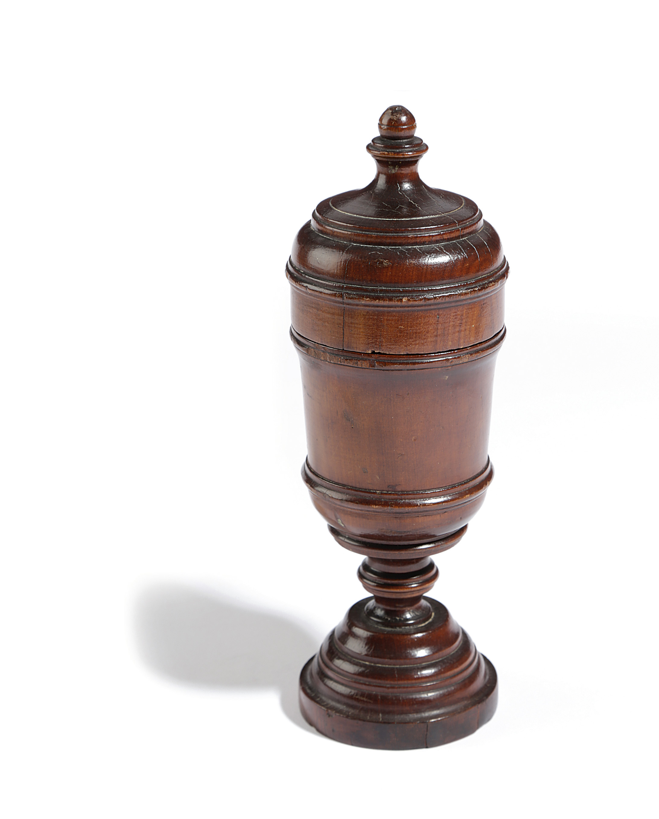 possibly apple or cherry, the lid with a turned finial, the body with reeded bands, on a stepped foot