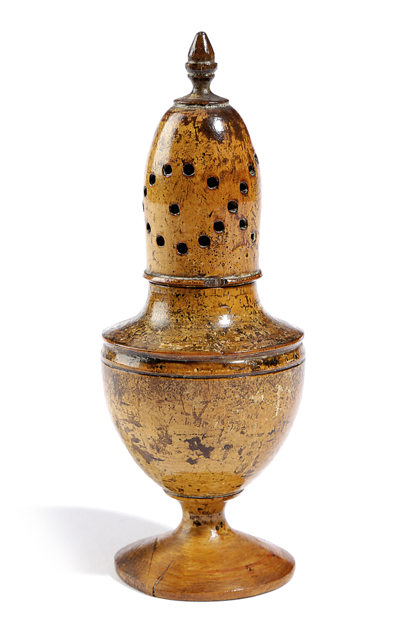 A GEORGE III TREEN PAINTED SYCAMORE CASTER OR MUFFINEER