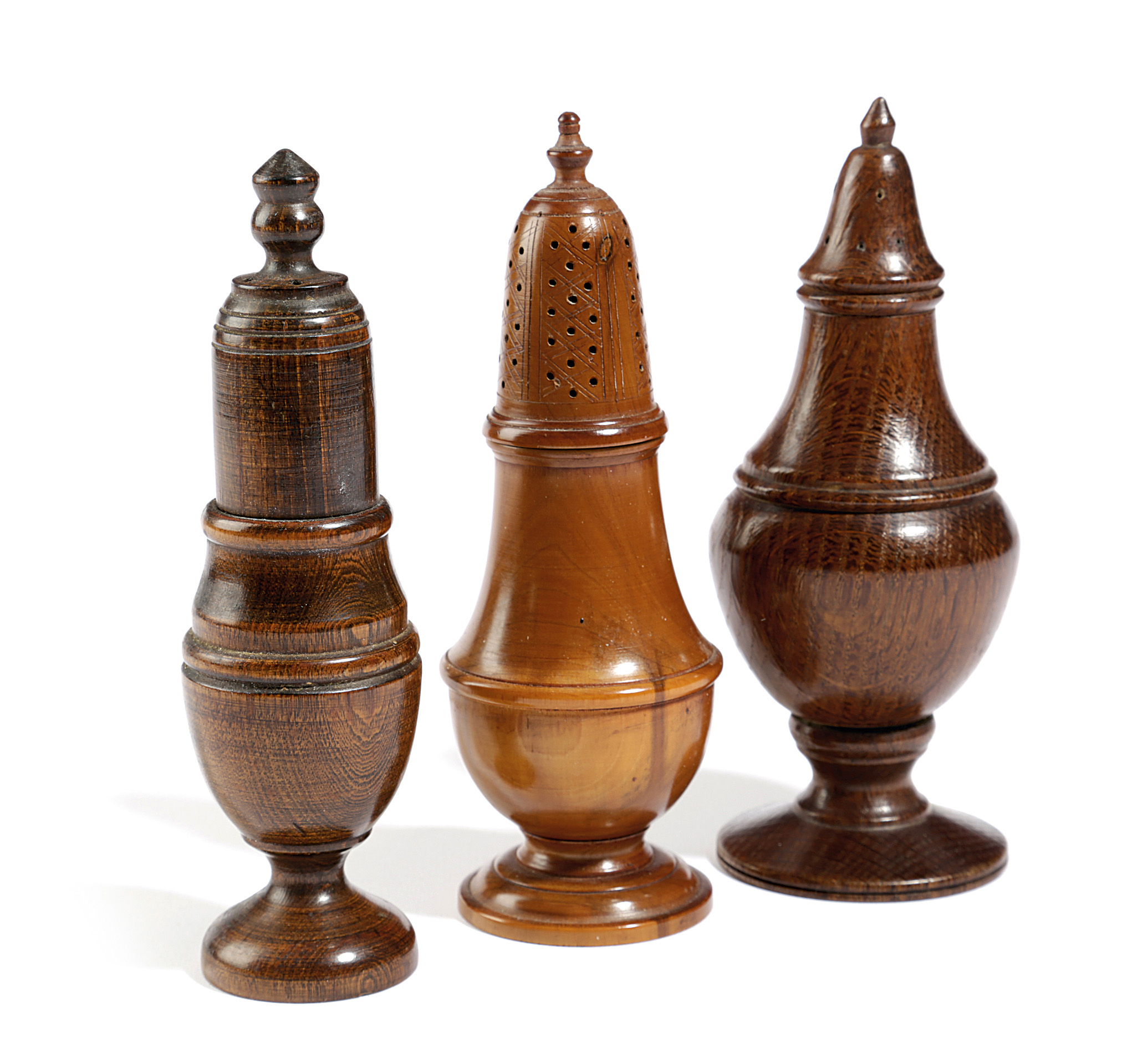 one possibly yew, of baluster form and with a pierced cover, together with an oak example with a screw-off foot, the third of bullet shape (3)