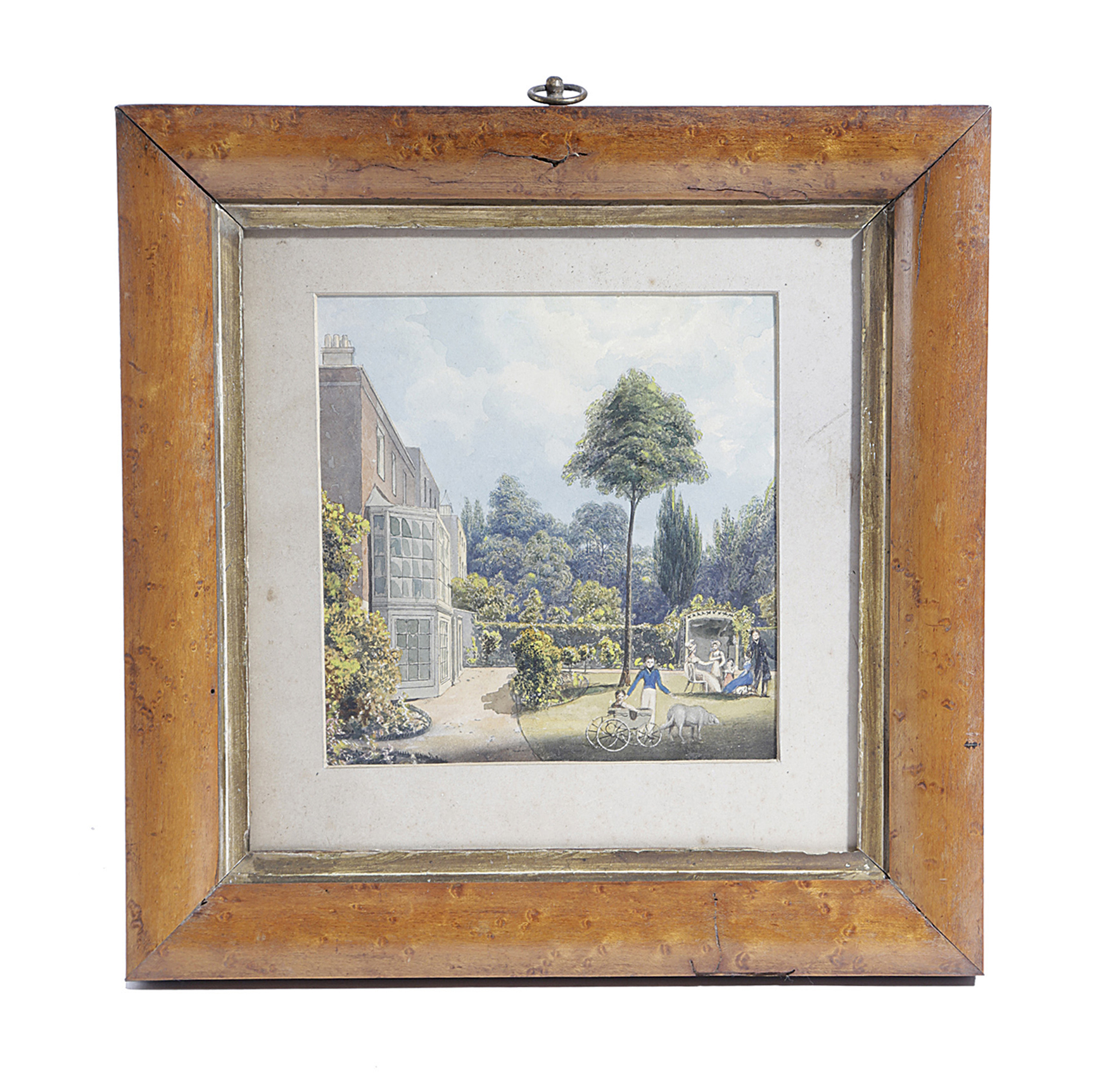 depicting figures taking tea in the garden of a Georgian house, in a glazed bird's eye maple frame