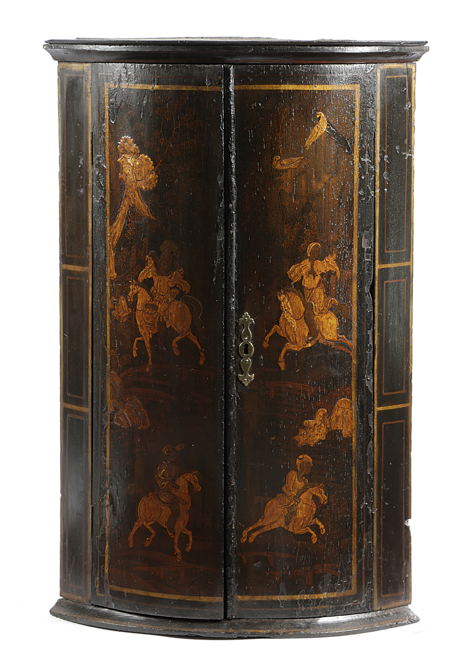 A GEORGE II BLACK JAPANNED BOWFRONT HANGING CORNER CUPBOARD