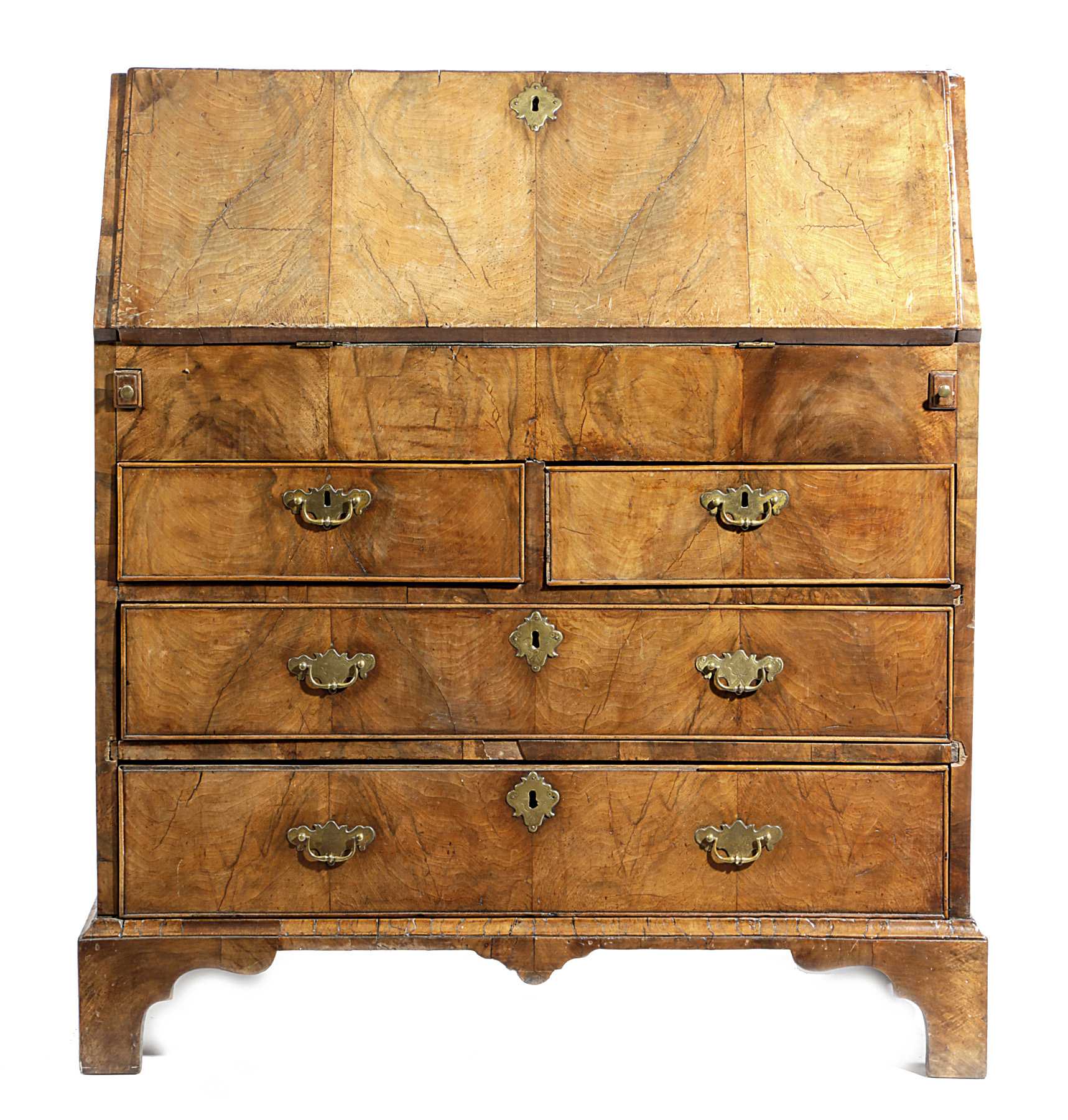 the stepped interior with drawers, pigeonholes, secret pilaster compartments and a sliding well cover, the later baize lined writing surface above two short and two long drawers