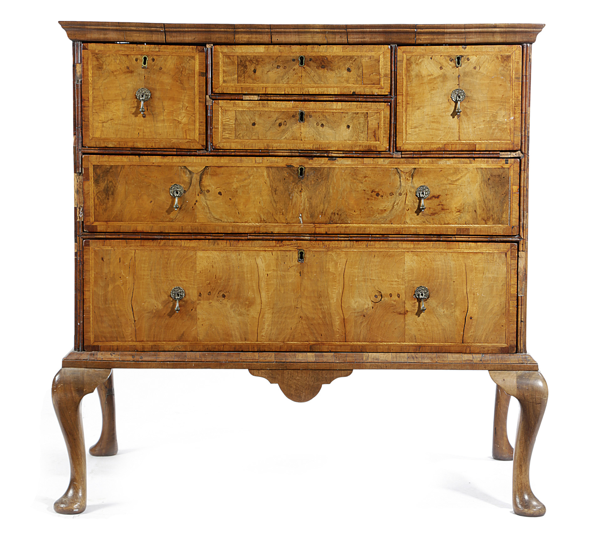 with cross and feather banding, fitted with an arrangement of six drawers, on cabriole legs