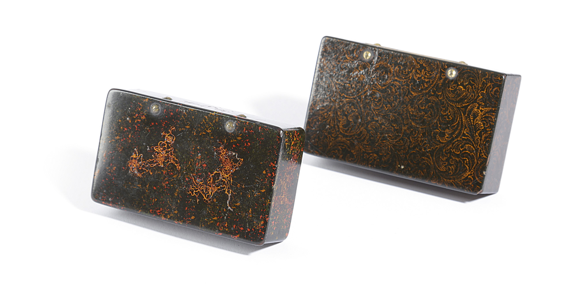 TWO LACQUERED PAPIER-MACHE SNUFF BOXES