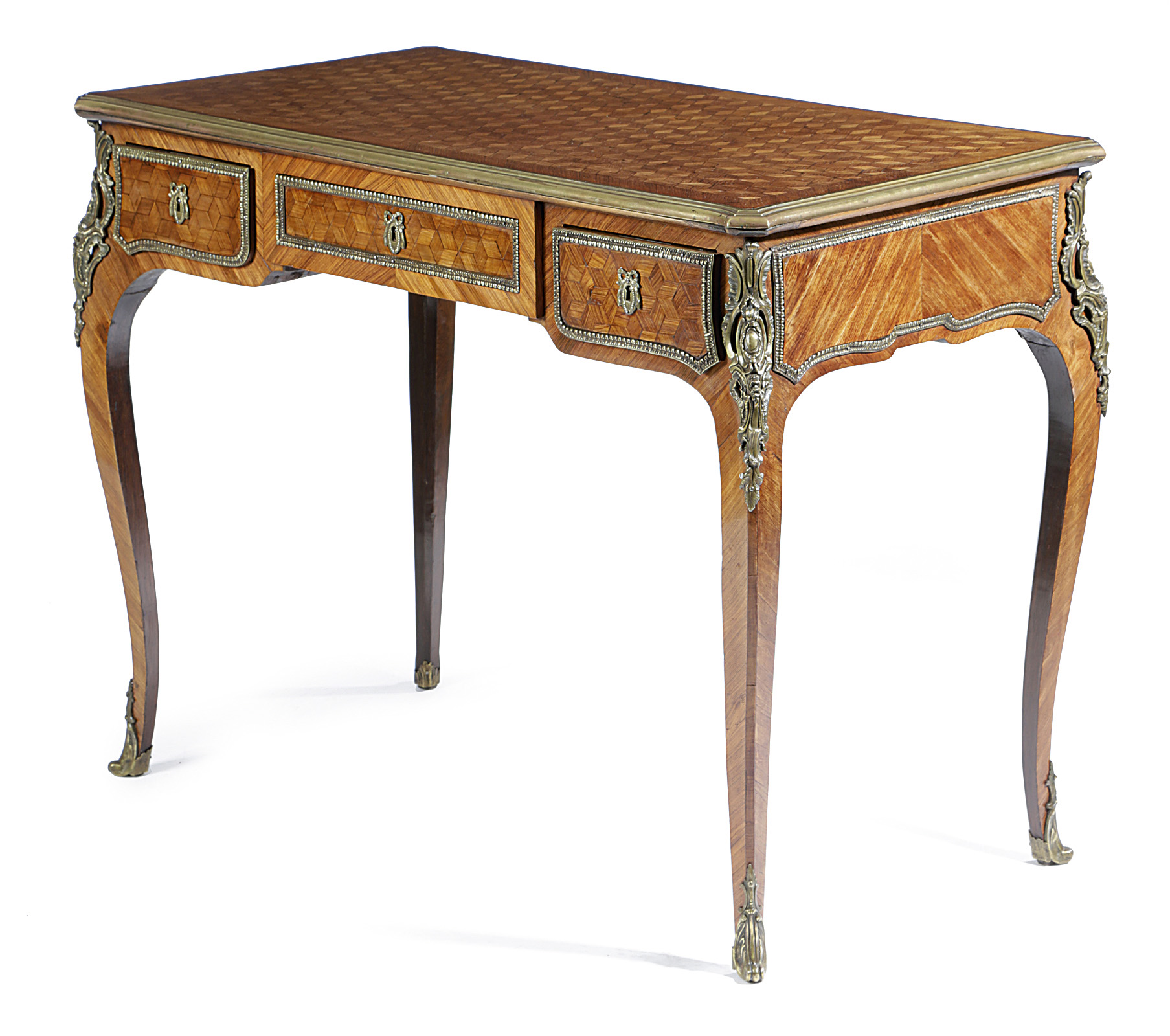 A FRENCH KINGWOOD AND PARQUETRY BUREAU PLAT IN LOUIS XV STYLE