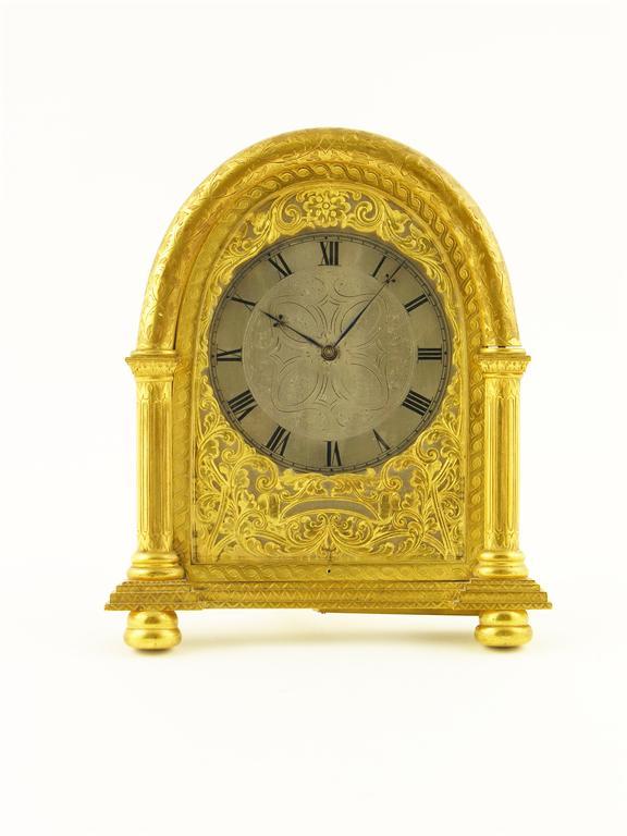 A Victorian gilt brass arched strut clock, the platform lever escapement within an enclosed back to an engraved silvered dial and a pierced fret front, the pilastered case in turned feet and a hinged strut, 6.25in (16cm) h.