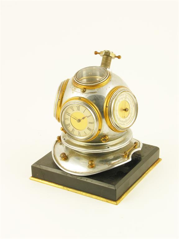 A chrome novelty desk combination clock, modelled as a diver's helmet, with a compass, clock, thermometer and barometer, having silvered dials, the clock with a cylinder platform escapement, stamped '1015,' mounted on a black marble base with brass rim, 7.5in (19cm) h.