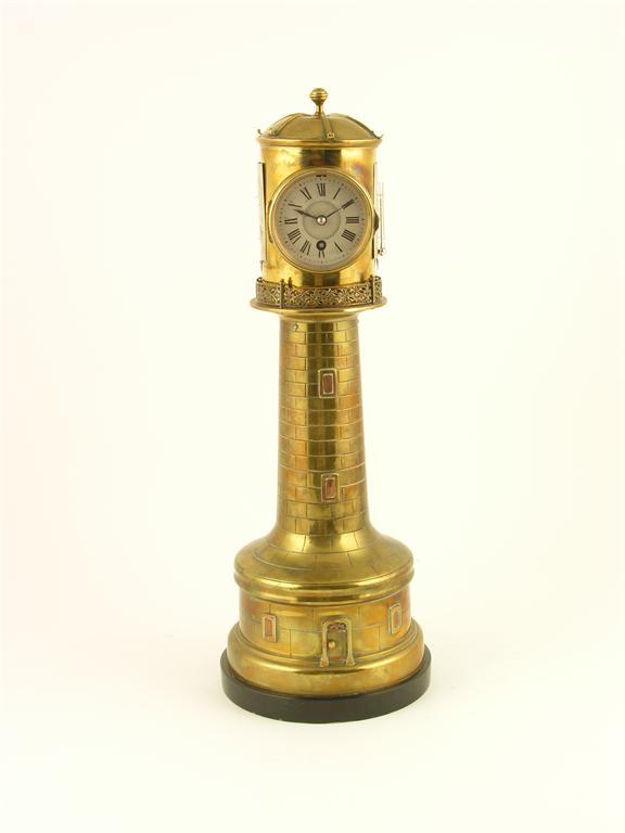 A brass automaton 'lighthouse' clock, barometer and thermometer, the revolving top with silvered dials, the clock with a cylinder platform escapement and stamped '2248', the two thermometer dials in English and French, the base with a door to the winding mechanism, 16.75in (42.5cm) h.