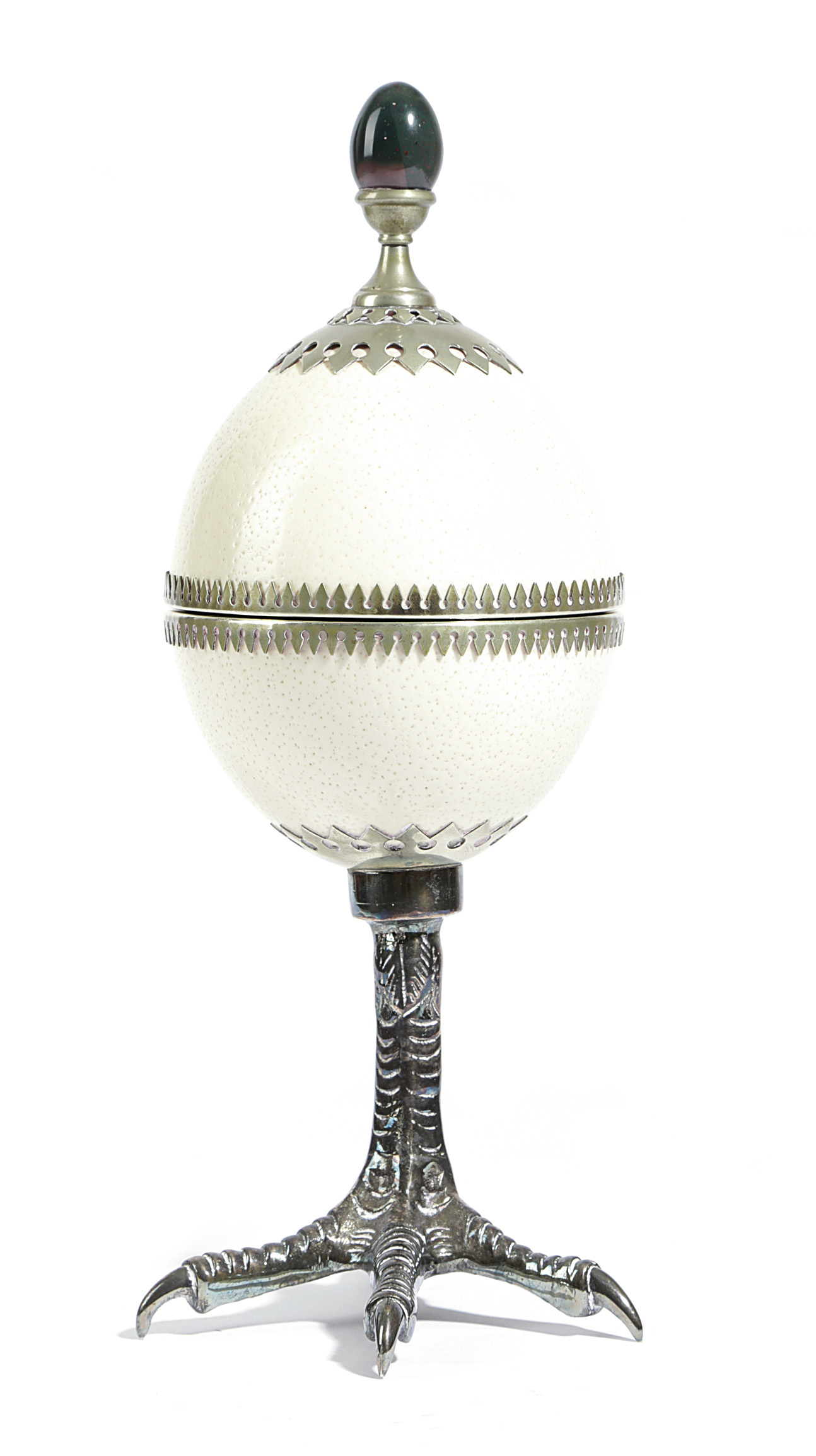 AN OSTRICH EGG AND WHITE METAL CUP AND COVER